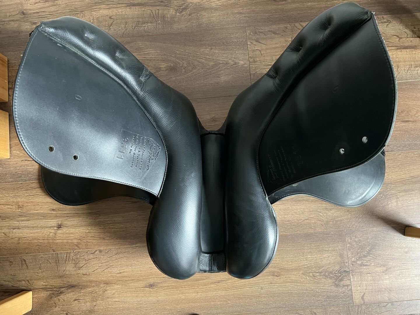 Kieffer Passion One Eventing Zadel - Slechts 10 maanden jong Stoelmaat 0 Zadelboom met slokdarmplaat - individueel instelbaar door koudvervorming Knierollen met klittenband voor het veranderen van de positie of voor variabele vervanging Verwijderbare kuitblokken Met decoratieve stiksels boven de pommels Korte strepen