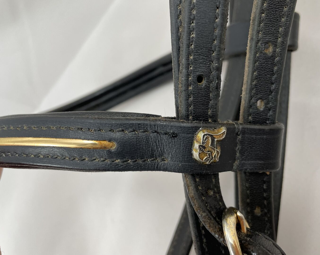 Kieffer Snaffle, Zweeds gecombineerd, maat WB, kleur zwart/goud - Verkoop gebruikte Kieffer snaffle, Zweedse gecombineerde neusriem, maat warmbloed, kleur zwart, frontriem en neusriem zijn goud gevoerd. Het beslag is ook van goud en vrij groot. Het hoofdstel is goed verzorgd maar heeft natuurlijk wel gebruikssporen (zie foto's). Hoofdstel inclusief webteugels met hetzelfde beslag. Schrijf voor meer exacte afmetingen.