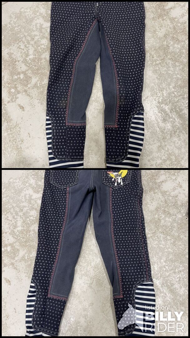 Kinder rijbroek - Ik verkoop een paar ELT kinderbroeken in maat 122 cm, die niet veel gebruikt zijn en in perfecte staat verkeren. De broek heeft een vol zitvlak en een borduursel van een eenhoorn op de achterzak. De broek is donkerblauw met kleine witte sterren. Rond de enkel zit zacht elastiek, dat voorkomt dat de broek omhoog komt.