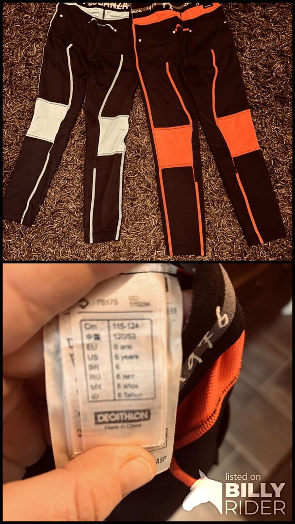 Kinderbroekenset 116/122 6 jaar - Twee gebruikte maar nog in goede staat verkerende leggings voor kleine ruiters. Eén donkerblauw/lichtblauw Een donkerblauw/ roze