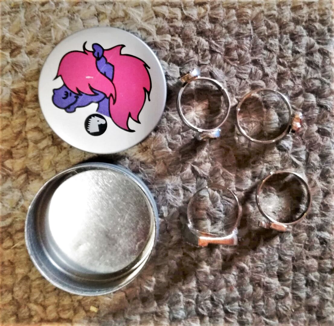 RINGEN (als set in een klein doosje) - 1x set ringen bestaande uit: 1x paardenhoofd zwart 1x stijgbeugel groot (versierd met steentjes) 1x hart rood 1x hoefijzer (versierd met kleine steentjes) 1x kleine metalen doos paardenhoofd Ringen ook apart verkrijgbaar