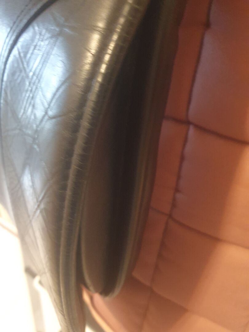De korte zadelkleppen zijn in goede staat, net als de stijgbeugelstangen. Het zadel is waarschijnlijk opnieuw gezwart voordat het bij mij kwam. Ik zou aanraden om de vulling te laten doen, maar dat is aan iedereen om te beslissen. Er zit een deuk in de achterkant van elk paneel, misschien is er iets ingedrukt tijdens de opslag. Het zadel heeft rimpels in het zitgedeelte, leerslijtage op de panelen en langs de naden van de biezen en kleine krassen. Ik heb het zadel al ontvangen zoals het is. Het wordt verkocht zonder accessoires.