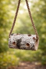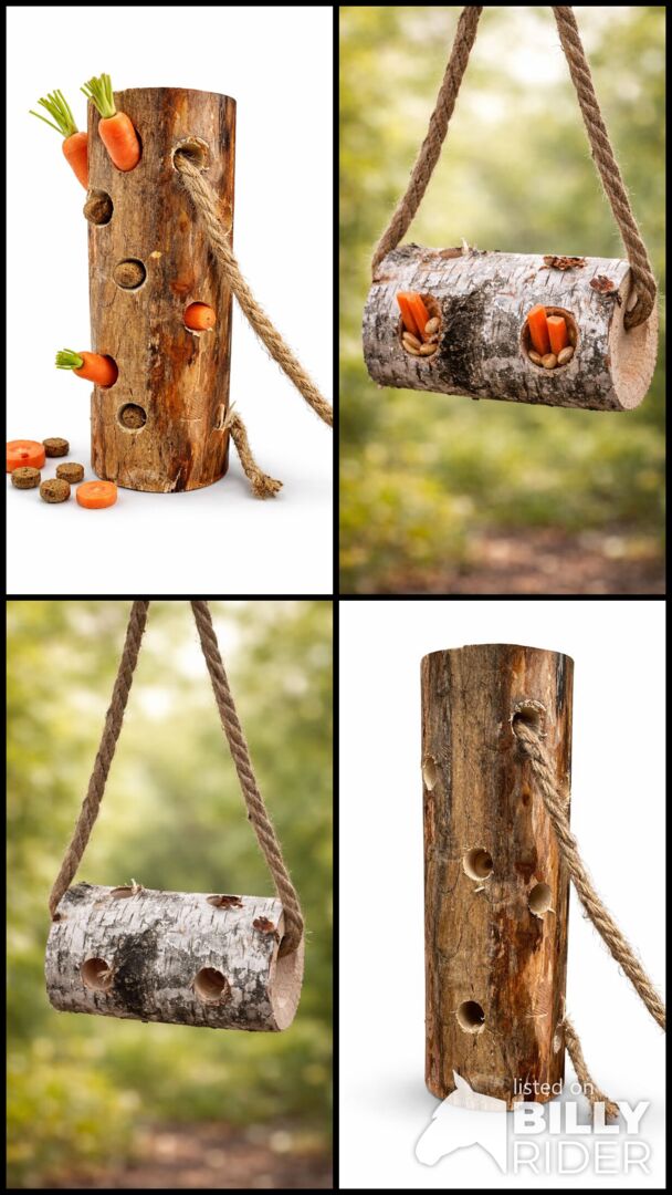 De massief houten stam wordt eenvoudig opgehangen en kan worden gevuld met lekkers, wortels of kruiden. Door de gaten aan de zijkant moet je paard spelenderwijs werken voor zijn eten - ideaal om verveling in de box of paddock tegen te gaan.
