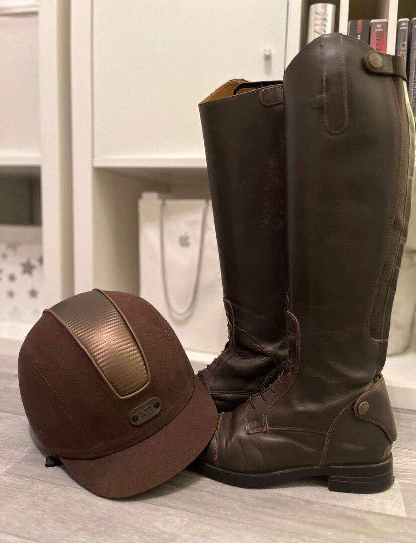 Ich verkaufe meine selten genutzten Steeds Reitstiefel (Reitstiefel Favourite III) der Größe 38 in Slim und der Farbe Braun. Am linken Stiefel ist die Naht ein wenig aufgerissen, ansonsten befinden sich die Stiefel in einem guten Zustand. Ebenso verkaufe ich meinen kaum getragenen Knightsbridge Reithelm (Reithelm Glory) der Größe M, ebenfalls der Farbe Braun. Der Helm ist sturzfrei und befindet sich in einem sehr guten Zustand.
