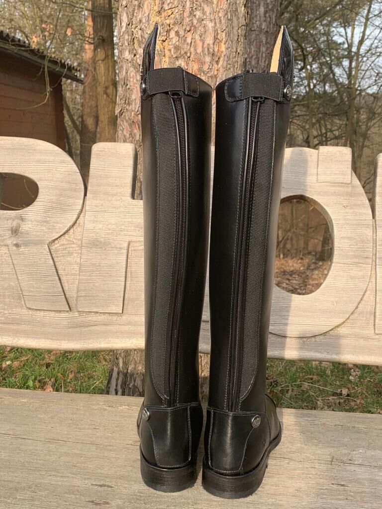 Königs Nieuwe Stijl Leren Rijlaarzen - Als nieuw! En originele verpakking - de foto's spreken voor zich: met smalle patentrand en koninklijke kroon Bovenleer: kalfsleer leren voering duidelijke lijnen zonder vetersluiting ritssluiting aan de achterkant tot onderaan met ritsbescherming Elastische rug voor optimale aanpassing aan uw been doorgestikte zool met extra rubberen zool