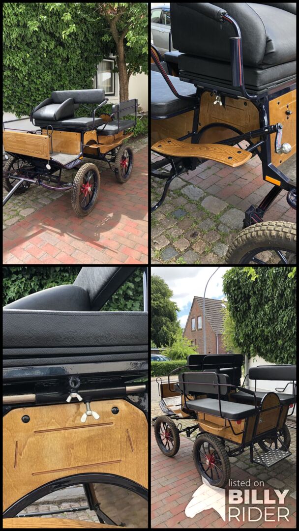 Koetsier - Wagen zo goed als nieuw 6 zitter luchtbanden Schijfremmen Kan met één of twee paarden gereden worden Incl. éénpaardsschaar Incl. dissel voor 2 paarden Spoorbreedte: 1,27m (buitenrand band tot buitenrand) Bokhoogte onderkant: 1,05m Hoogte bovenkant bok: 1,13m Afneembare bestuurdersstoel hoogte: 20cm