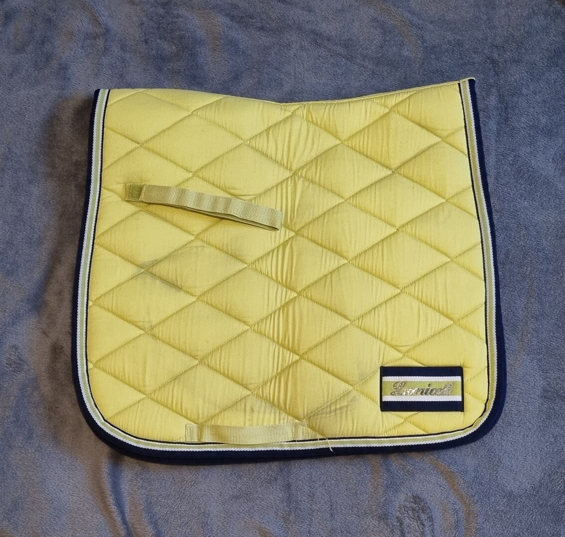 Lamicell SPARKLING Dressuur Zadeldekje DR groen/navy/groen/blauw - Ik verkoop een heel mooi dressuurzadeldek van Lamicell in de kleur groen/navy met gestreepte rand. Aan de linkerkant zit een Lamicell embleem. Het zadeldek is gebruikt en vertoont lichte gebruikssporen aan de onderkant, verder is het in goede staat.