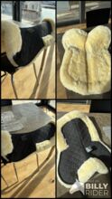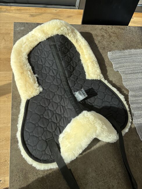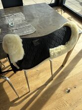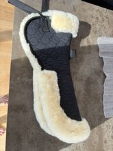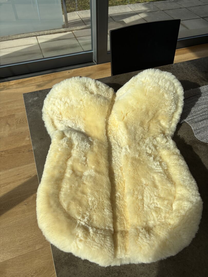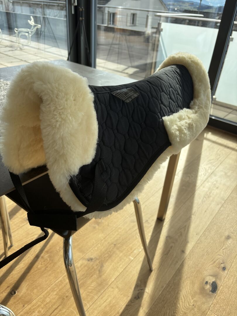 Mooi, dik zadeldek van echt lamsvel. Zwart met natuurlijk lamsvel. Slechts 1-2 keer onder het zadel gebruikt. Terugliggend/dunnere lamsvacht langs het wervelkanaal. Met lusjes voor zadelbevestiging. Helaas iets te klein voor mijn 17,5 inch dressuurzadel. Daarom "helaas" te koop