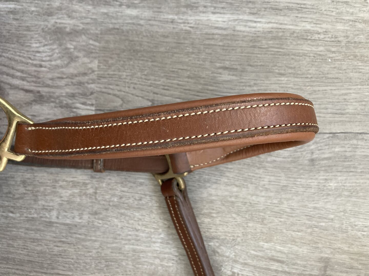 Bruin lederen halster in maat WB. Hals en neus zacht gevoerd en leer in lichtere kleur, contrasterende stiksels.