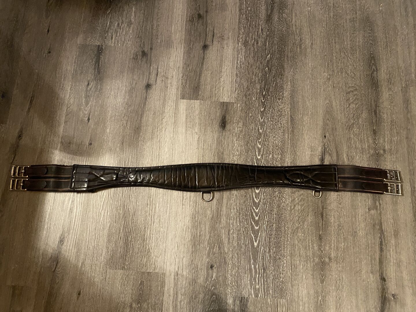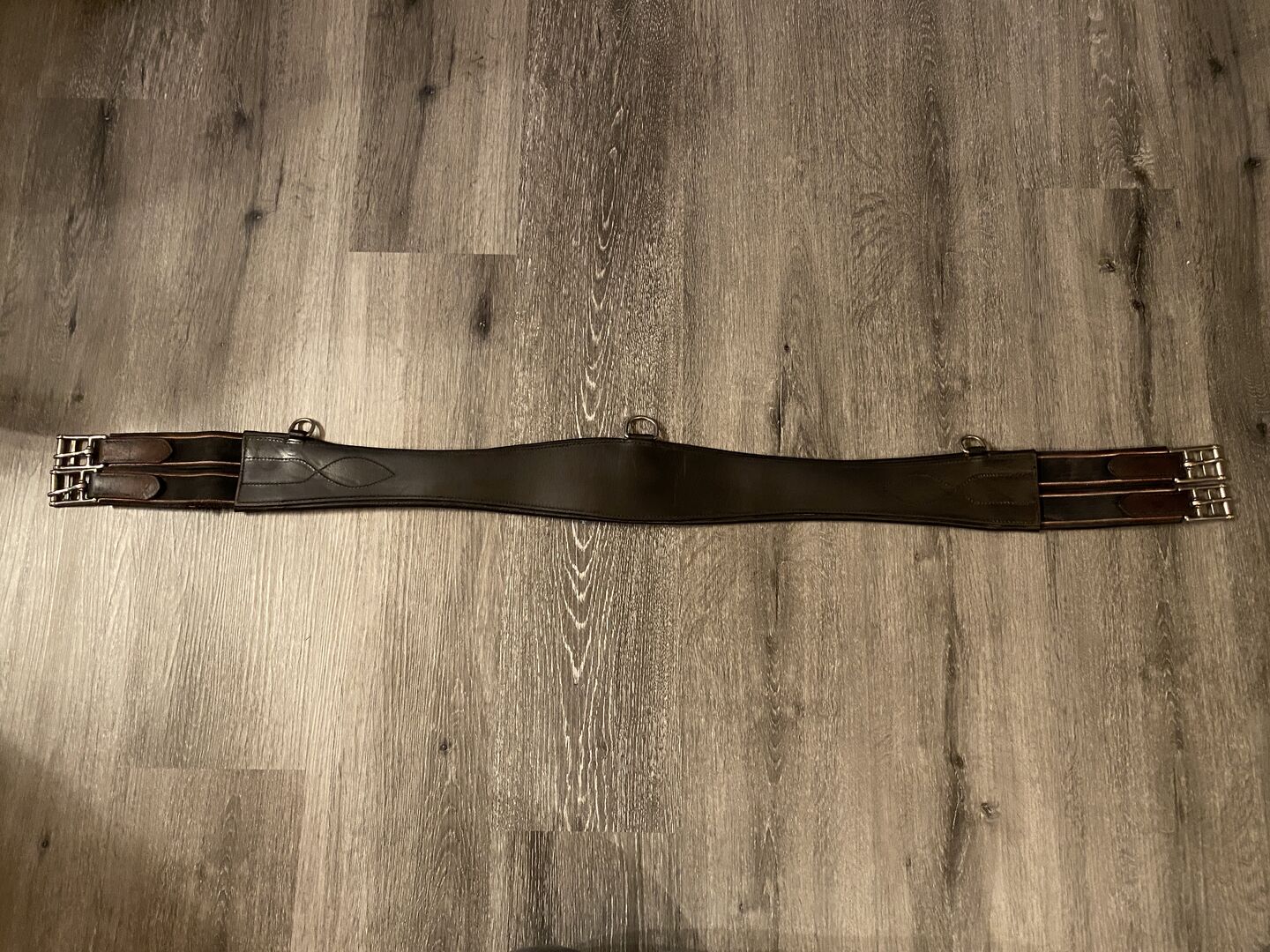 Lederen zadelsingel 110 - Ik verkoop een gebruikte maar nog in goede staat verkerende leren singel. Het heeft elastische inzetstukken aan beide zijden, wat het herbevallen vergemakkelijkt. De singel zelf is zwart, de leren riempjes op de gespen zijn bruin. Maar omdat je ze niet kunt zien onder de zadelklep, heb ik me er nooit aan gestoord. Als het je stoort, kun je de kleur veranderen met leerverf. De singel heeft 3 D-ringen.