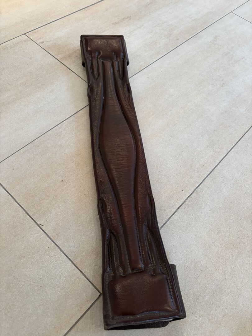 Lederen zadelsingel bruin 60 cm kort lederen zadelsingel - Leren zadelsingel (denk ik) van Krämer in bruin leer. We vonden het geweldig, maar het paard is afgevallen na zijn veulenonderbreking en dus geven we het graag weg.