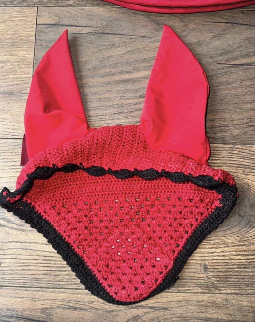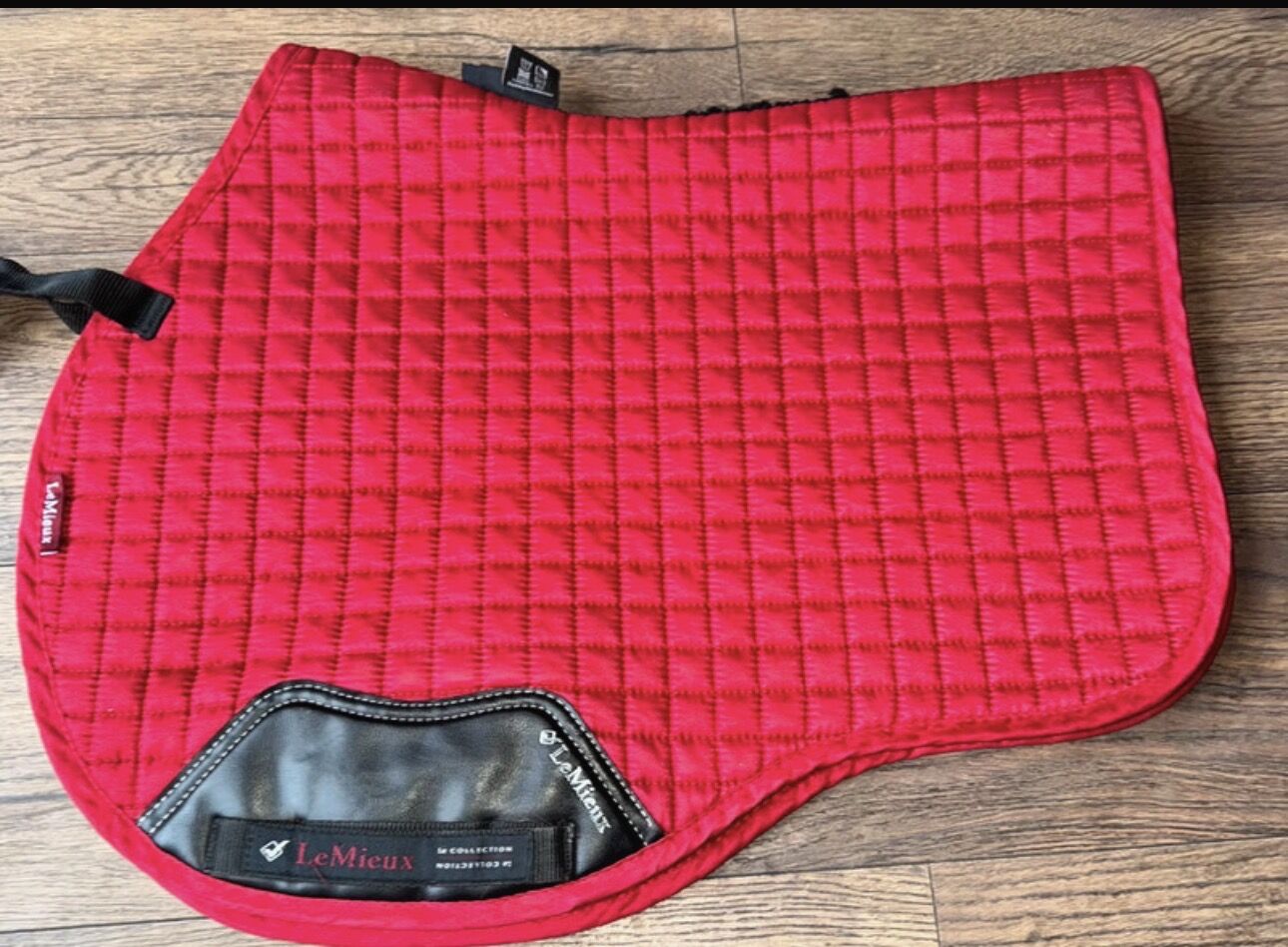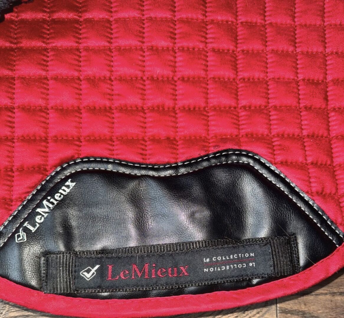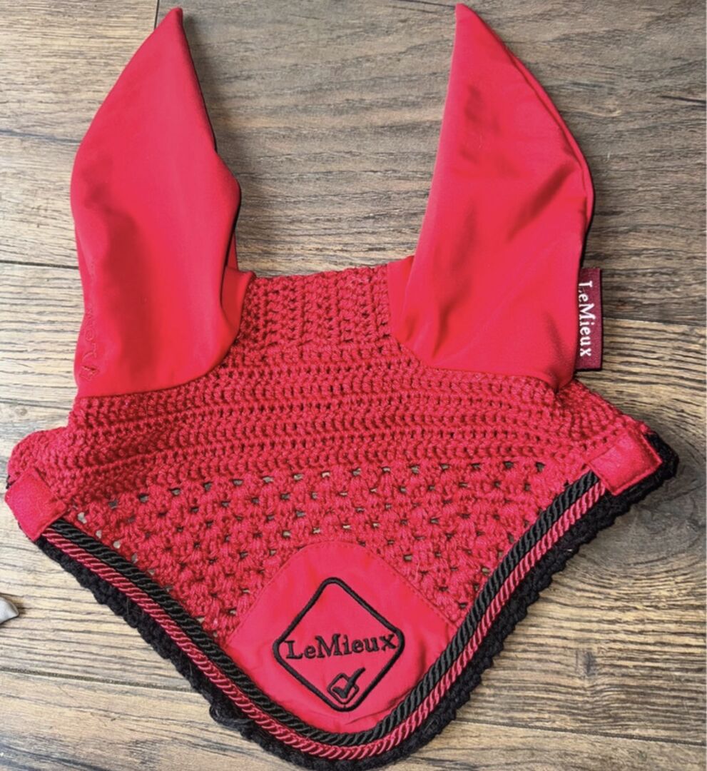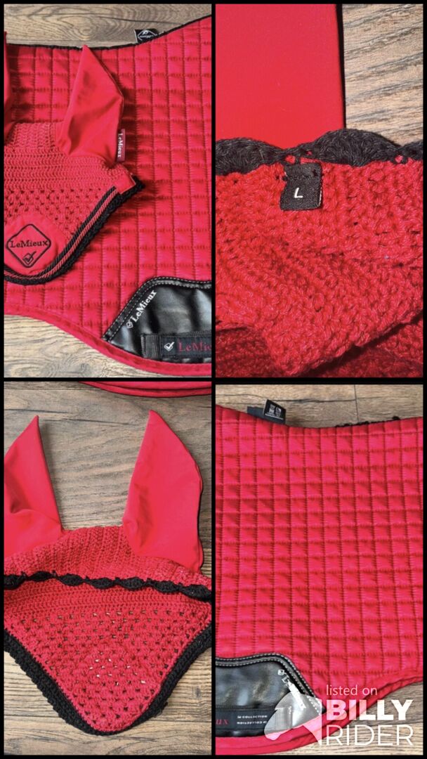 Matching LeMieux suede GP square and Classic Lycra fly hood in the colour Chilli, both size Large.