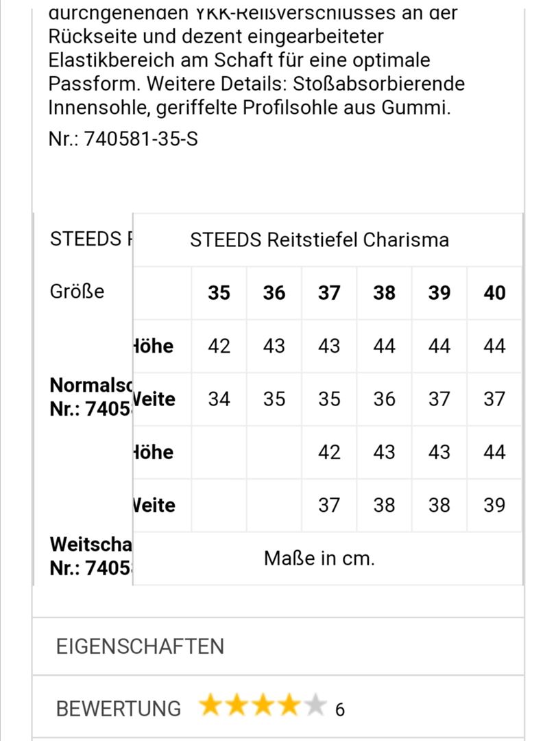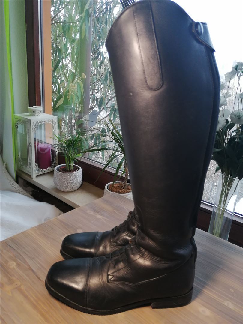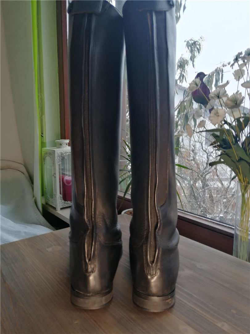 Leren dames rijlaarzen in goede staat, maat 40/40.5 - Gebruikte maar nog in goede staat verkerende lederen rijlaarzen model Charisma van Steeds. Ze zijn niet lang of regelmatig gedragen, maar ze hebben toch kleine krasjes en vlekken. De zool is niet versleten. De ritsen werken prima. Conditie, zie foto's. Originele prijs 179 € Maat 40 / 40,5 De kuitbreedte wordt vermeld als 37 cm. De hoogte gemeten vanaf de grond: buitenkant: 50 cm binnenkant: 45 cm op de rug: 48 cm (buiging van de knie) De hakhoogte is 2 cm.