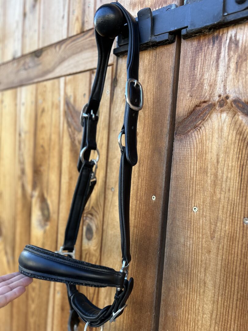 Leren halster Koninklijke H WB - Te koop is dit prachtige zwart leren halster "Glamour" met zwarte glitters op de neusriem van Royal H Schmuckunikate. Helaas te groot gekocht op een beurs. Het is daarom maar één keer gedragen om het uit te proberen. Maat WB Nieuwprijs 179,00€