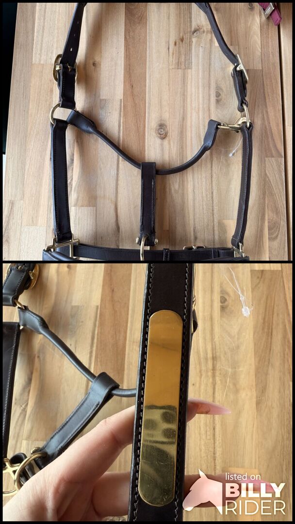 Leren halster NIEUW - Prachtig leren halster in bruin met anatomisch kopstuk en gegraveerde plaquette. Maat FULL, nooit gebruikt omdat het helaas te klein is.