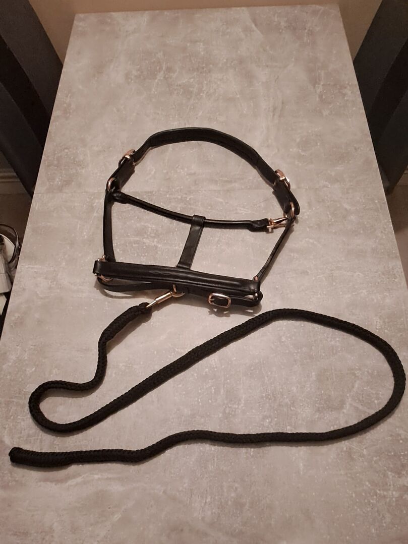 Leren halster roségoud - Leren halster met mooi borduursel en metalen plaatje voor mogelijke gravure. Met roségouden details. Het leer is heerlijk zacht en is maar één keer op mijn paard geweest voor een proefrit. Inclusief leidtouw met roségouden paniekhaak.