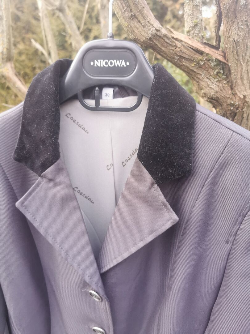 Loesdau paardrijjas toernooiblazer donkergrijs maat 38 bijna nieuw - Ik bied een onberispelijke, stijlvolle blazer aan van Loesdau in maat 38. De blazer is gedragen op twee shows en hangt nu helaas gewoon in de kast. Hij ziet er dan ook nog als nieuw uit, al kunnen mijn ietwat amateuristische foto's dit niet perfect vastleggen .... Je bent van harte welkom om de blazer persoonlijk te passen. De snit is iets langer en ziet er heel elegant uit.
