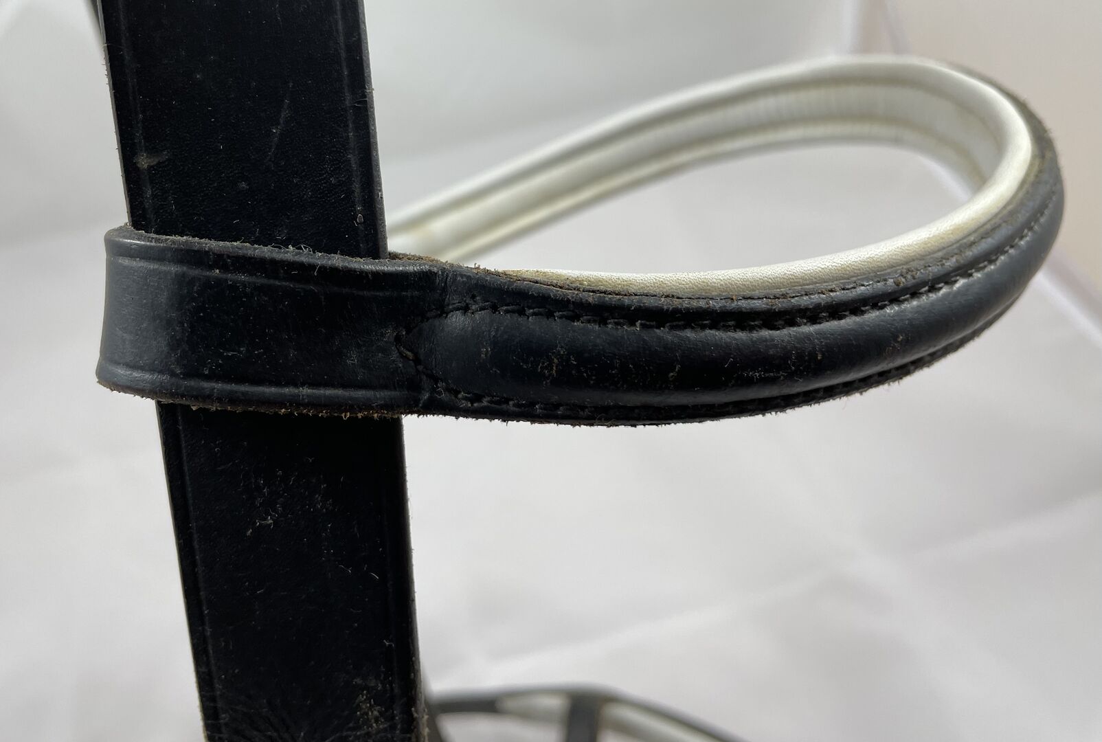 Ik verkoop mijn gebruikte zwarte Loesdau leren snaffle met teugels. Warmbloedmaat die nog niet zo lang gedragen wordt door grote warmbloedjes maar er gedragen uitziet door de witte onderlaag. Zwarte Engelse gecombineerde snaffle met witte vulling. Hoofdstel komt met zwarte web teugels met lederen stangen, maar ze zijn een beetje vuil.