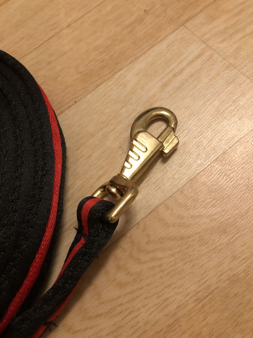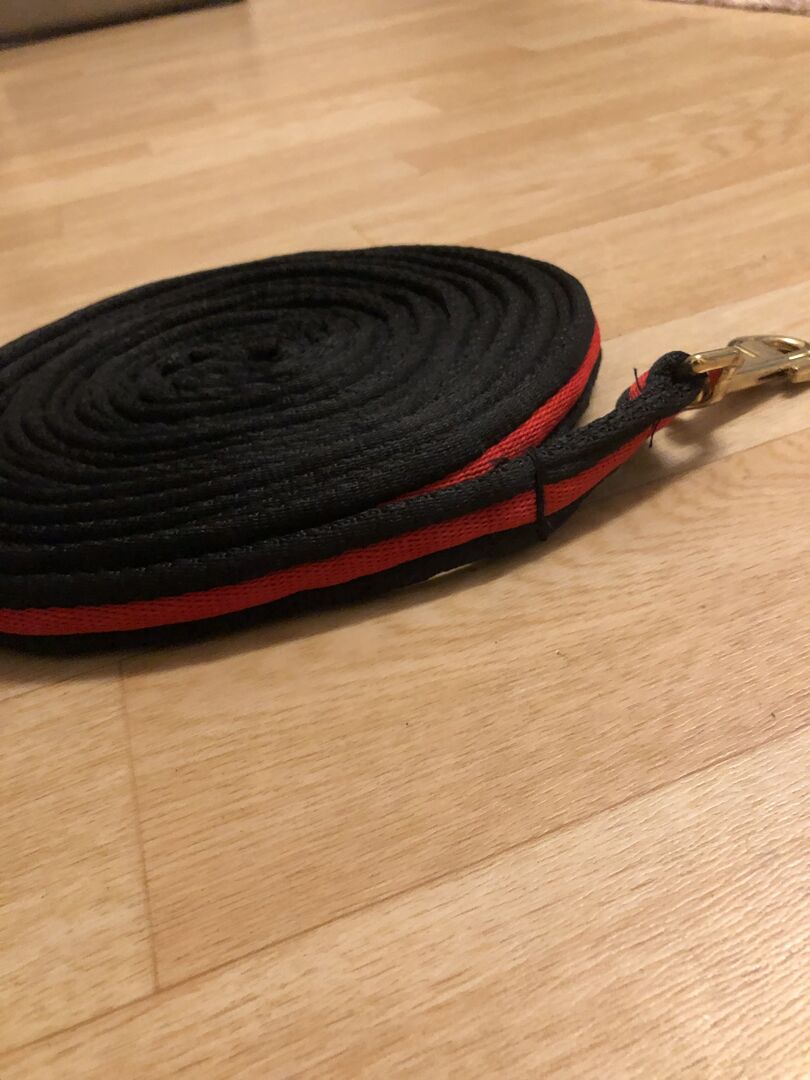 Longeerlijn 8m - De longe is maar één keer kort gebruikt. Het heeft geen gebreken en geen tekenen van gebruik. Het materiaal is gemaakt van zeer zacht nylon en is super duurzaam. Het is zwart-rood-zwart met een gouden karabijnhaak en 8m lang. Er is een grote handlus aan het einde van de longe voor een betere grip.