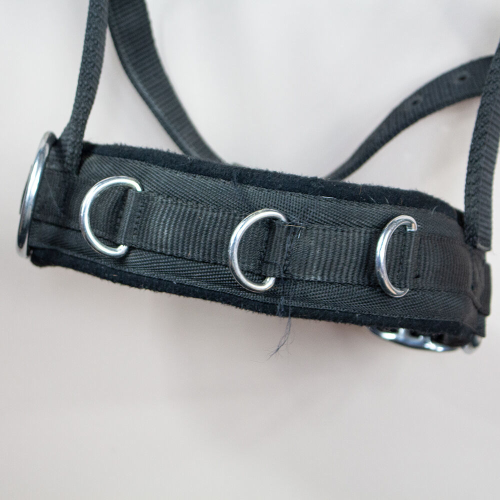 Longerende halster zwarte Cob - Het praktische zwarte longeerhalster is de perfecte metgezel voor dagelijks gebruik. Het is perfect voor longeren. Het halster is verstelbaar aan de hals en de neusriem en past daardoor op veel verschillende paarden en pony's. Het is maat Cob. Het is zacht gewatteerd. Het halster vertoont algemene gebruikssporen en heeft lichte verkleuringen. To the seller's offerlaunch