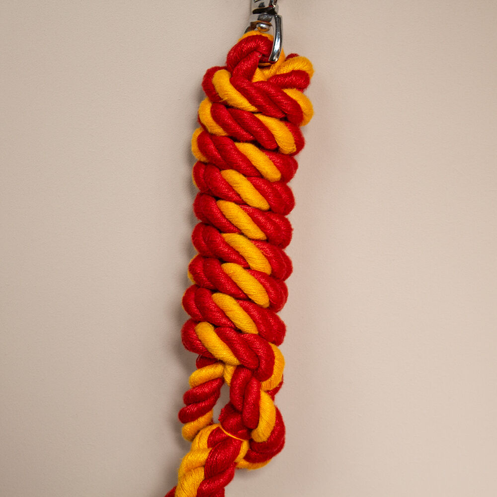 Loodkabel met karabijnhaak rood/ geel - Het mooie rode en gele touw is bijzonder slijtvast. Het loodkoord in de kleuren rood en geel en is een echte blikvanger. Het heeft een zilveren karabijnhaak. Het touw vertoont sporen van gebruik, maar is in goede staat.