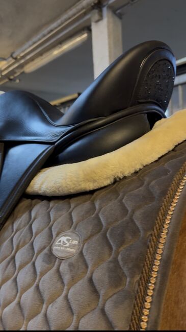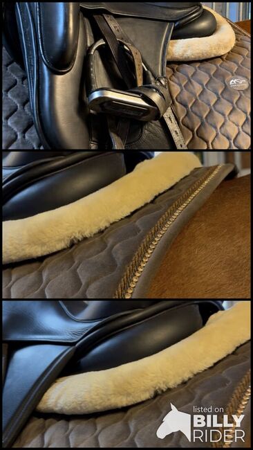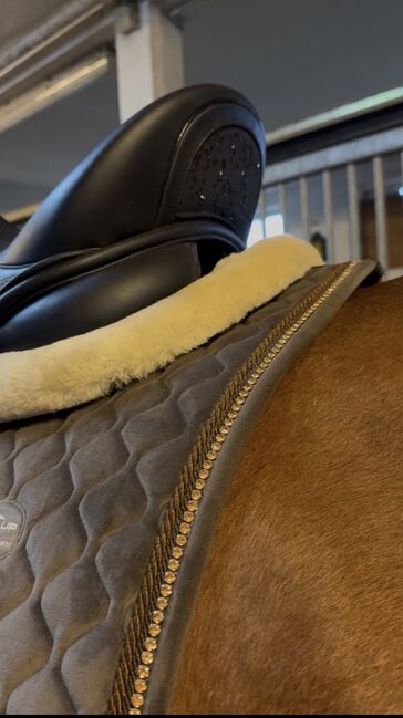 Der Sattel ist sehr wenig gebraucht und wurde sehr gut gepflegt und sorgsam gelagert. Demnach hat her kaum/ bis sehr wenige kleine Gebrauchsspuren. Hat auch dezentes, sehr schickes, dunkles Glitzer unter dem Sattelkranz.