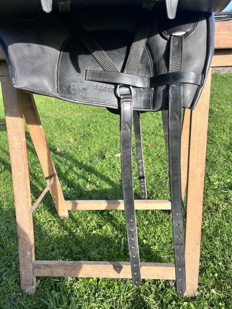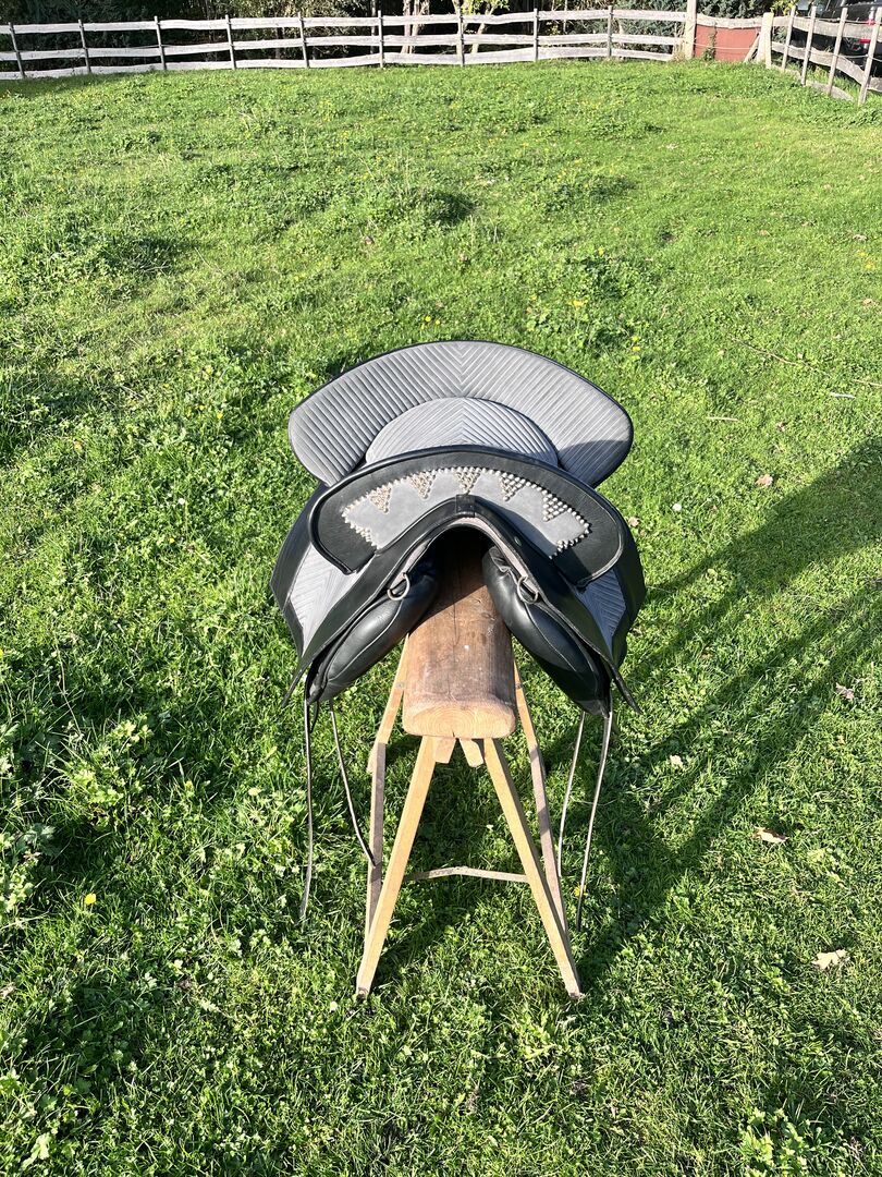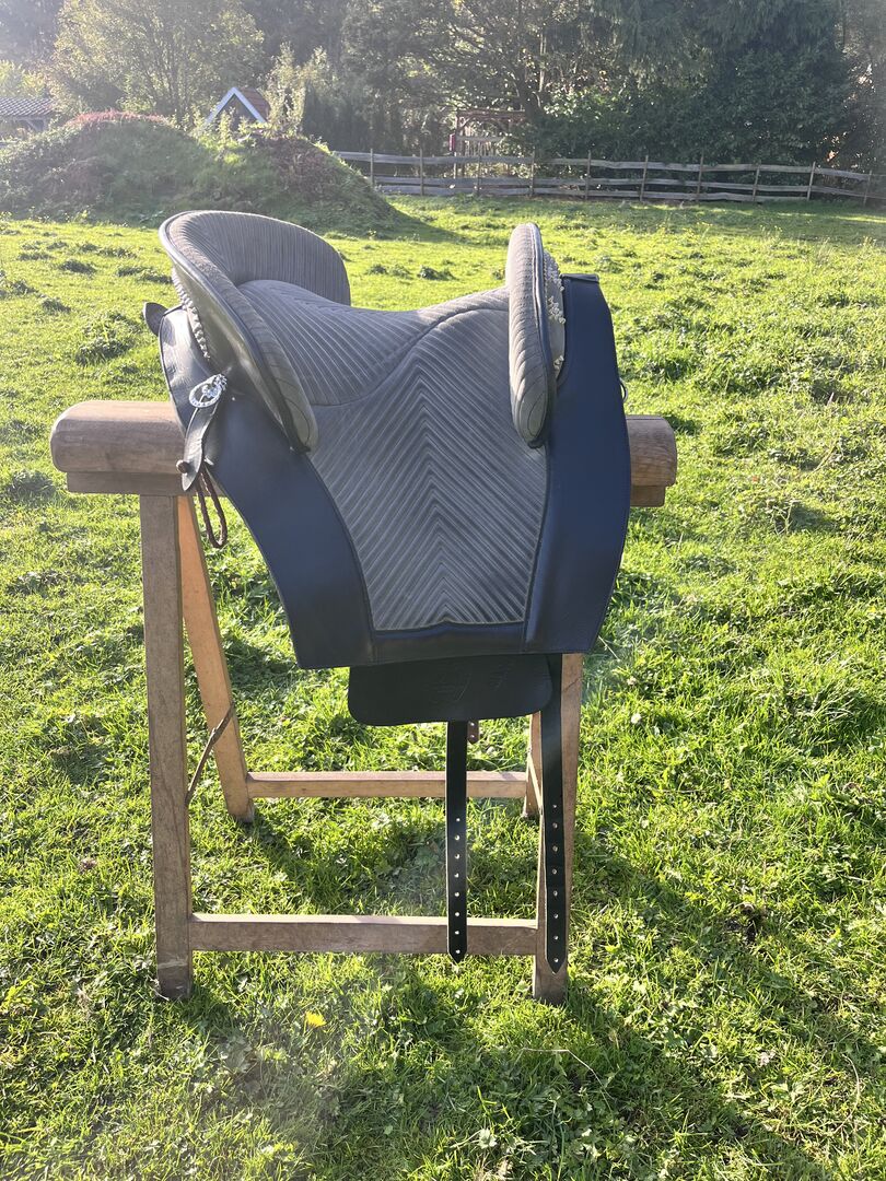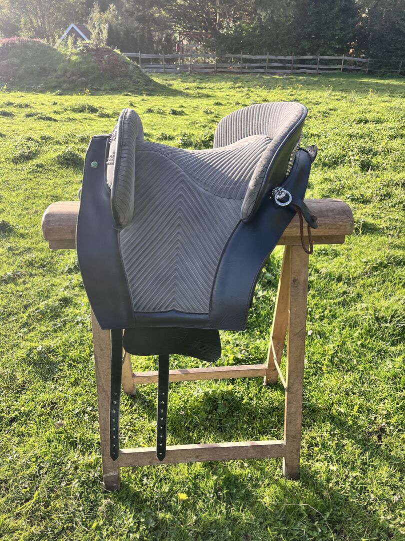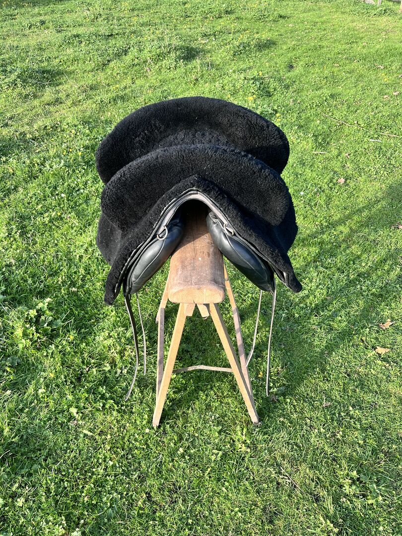 Prachtig Marjoman Riano zadel in grijs-zwart met bijpassende Zalea van schapenvacht, in zeer goede staat en zeer weinig gebruikt. Maat zitting, zie foto’s.