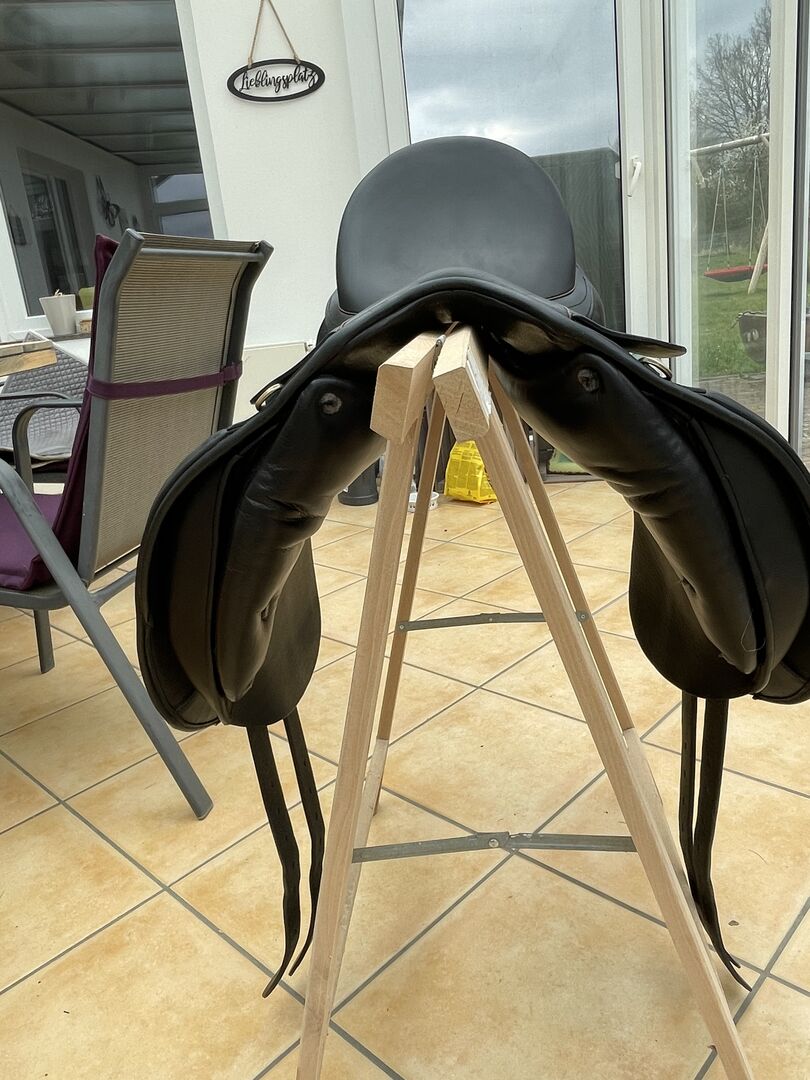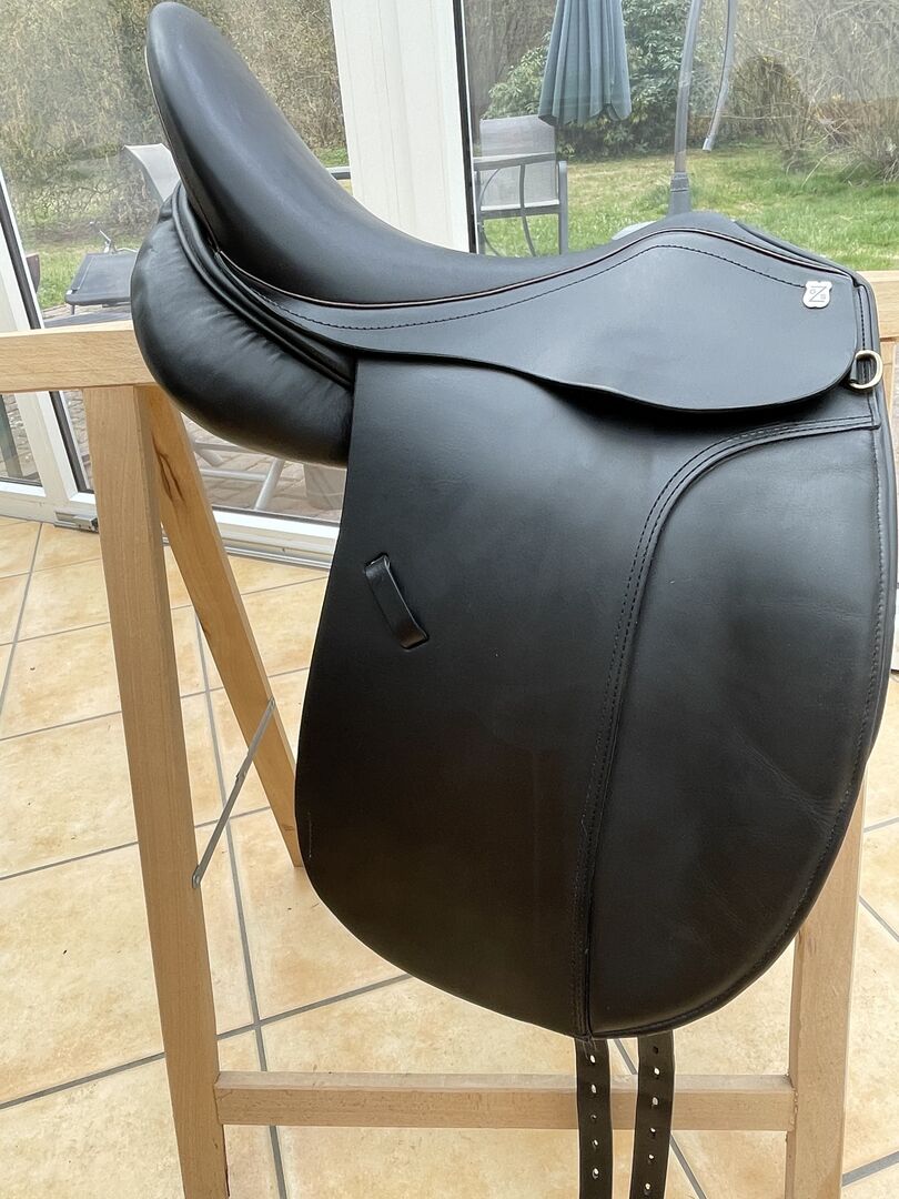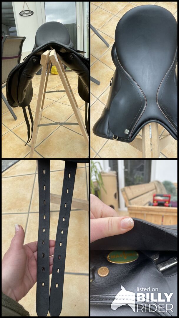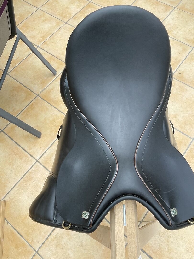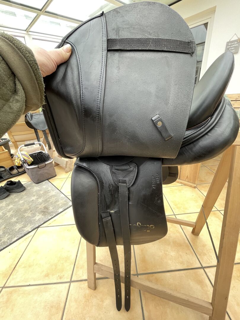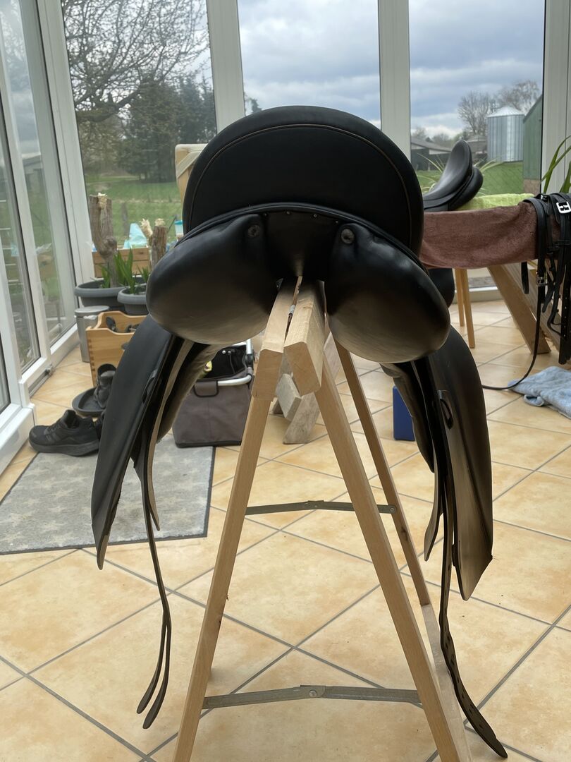 Massimo Dressage II FK KW 38 17 inch - Ik verkoop binnenkort (nieuw zadel besteld) mijn Massimo Dressage Saddle II met een kamerbreedte van 38 momenteel verbreed naar 39. Het zadel kan door de zadelmaker gemakkelijk twee sprongen naar beneden of naar boven koud worden gemaakt (KW 36-40). Optimaal voor Haflingers, Friezen, Tinkers met brede schouders/rug, korte zadelflanken (contactvlak 39-40 cm) en weinig swing. Hij heeft ook een breed wervelkanaal. Dit is een handbreedte van -7 cm op het smalste punt. Het zadel is van 2016, maar weinig gebruikt, zoals je op de foto's kunt zien. Het zadel werd volledig opnieuw bekleed in 9/21 en is in onberispelijke staat. De zitmaat is 17 inch, maar valt groot uit vergeleken met andere zadels. Ik pas er goed in met een broekmaat 40/42 en hij past ook meer petite rijders.