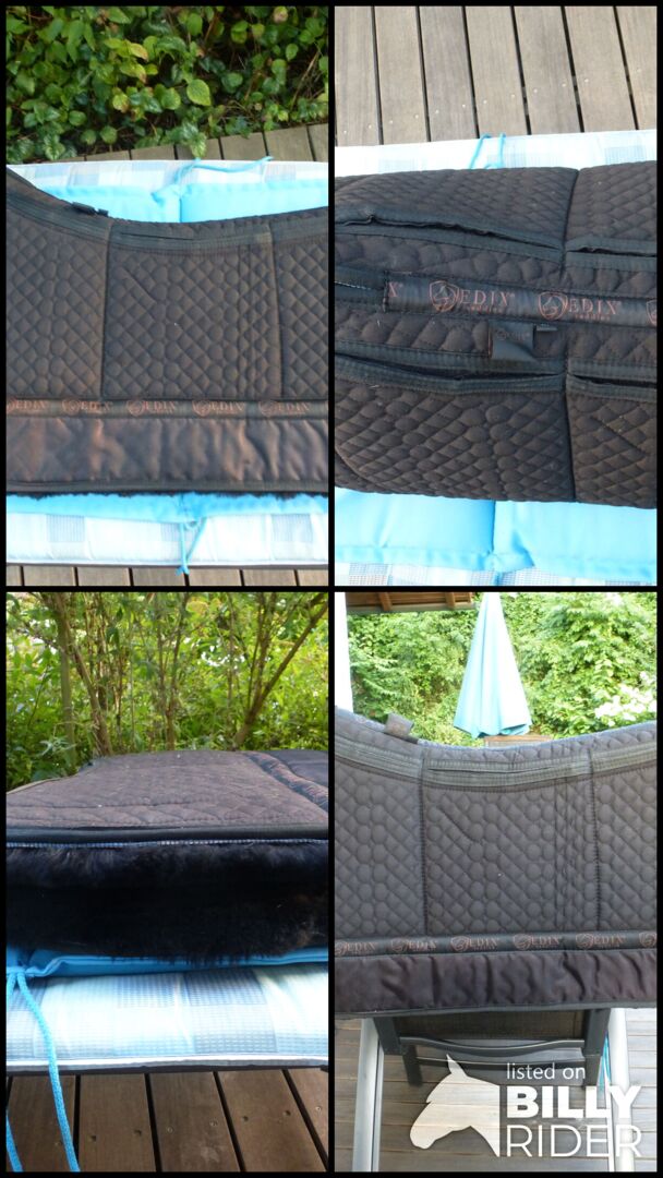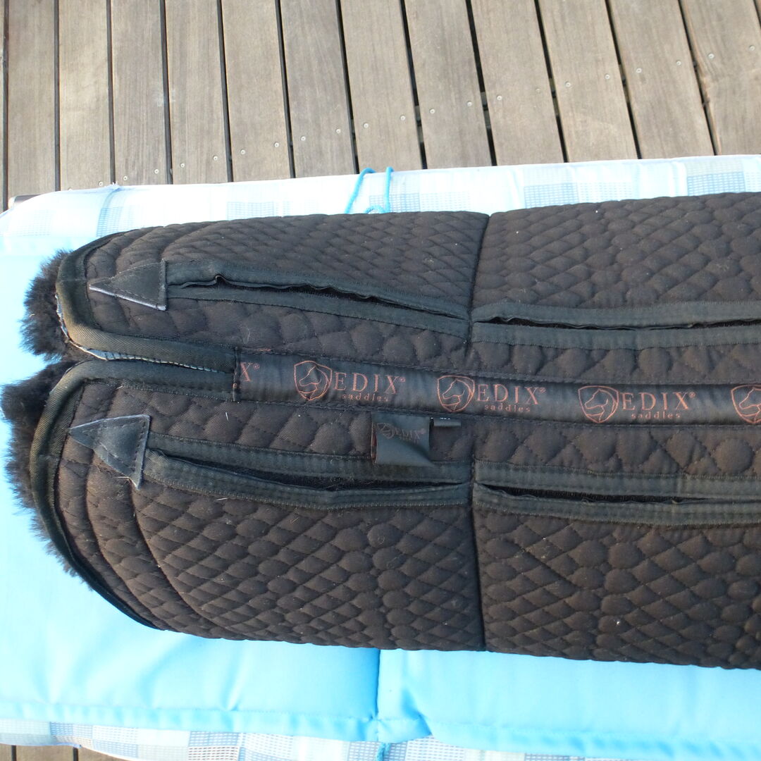 Matten Westernpad Correctionpad lamsvel - Edix westernonderlegger lamsvel boomloos westernplein gemaakt van slijtvast en zeer zacht en ademend materiaal (100% katoen) met echte lamsvacht onderzijde - ca. 30 mm in het zadelgedeelte, met gereduceerd neerwaarts wervelkanaal ca. 10 mm. Corrigerend drukvereffeningssysteem met acht zakken en vilten inzetstukken. Twee lange inzetstukken (ca. 9 mm) voor de onderste grote zakken. Evenals zes kleinere zakken (drie aan elke kant). Hoge schoft en gedeelde schoftnaad voor meer flexibiliteit. De 10 mm lamsvachtvulling in het wervelkanaal is belangrijk voor alle zadels en vooral voor boomloze zadels, omdat het schuren kan voorkomen, bijv. in het schoftgebied. Het TOP-alternatief is geschikt voor Freemax westernzadels of andere boomloze westernzadels. M : lengte 71 cm (A-B rug) / 75 cm (G-H middenpad), hoogte 37 cm (middenpad), schoftverhoging 45 zwart, de inlegzooltjes zijn natuurlijk inbegrepen. Ik heb er 229 euro voor betaald. Het was slechts twee uur onder het zadel en is dus zo goed als nieuw!