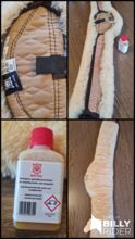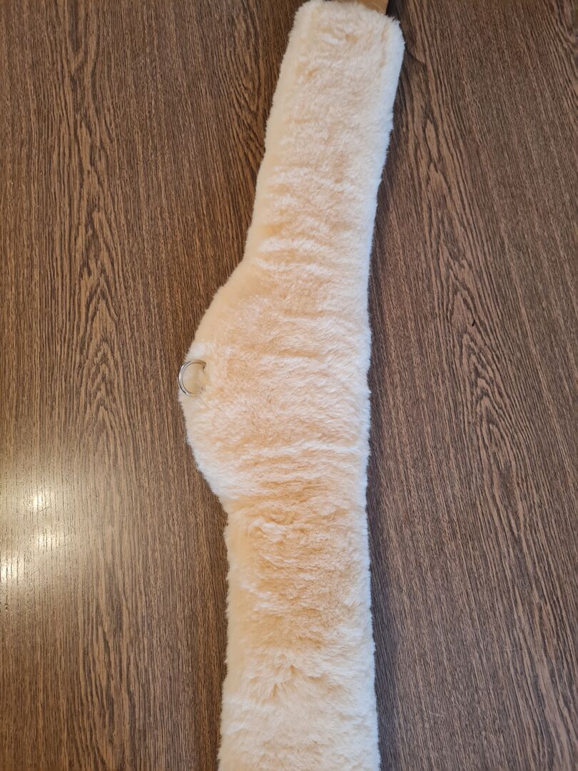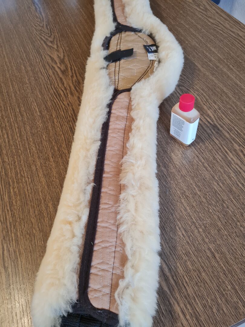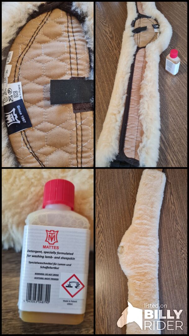 Mattes lamsvel singel 135 cm - Te koop is een lamsvacht singel van Matte met een lengte van 135 cm. De singel is helemaal nieuw en heeft nog nooit op het paard gezeten. Hij wordt geleverd met het bijbehorende wasmiddel van Matte.
