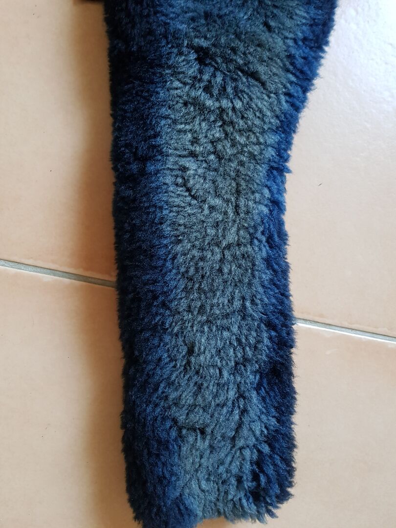 De singel heeft normale gebruikssporen. De singel en het lamsvel zijn zwart. Door het gebruik is het verkleurd en is het niet langer diepzwart maar grijsachtig geworden op de plaats van het paard. Beide lamsleren omslagen zijn in goede staat zonder beschadigingen.