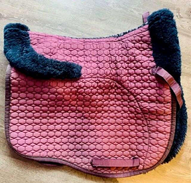 Mattes zadeldekje, bordeaux-rood, dressuurmaat L - Mooie bordeaux-rote Schabracke von Mattes met Lammfell in der Sattellage en oben am Rand. Die Schabracke ist gebraucht, aber absolut in Ordnung, das Fell ist nicht mehr ganz so fluffig wie am Anfang, aber nicht verfilzt. Het was gepflegt/gewaschen en gebürstet. Das Fell war ursprünglich schwarz, hat sich aber leider in Richtung dunkelblau verfärbt. (zie foto's) Der Stoff aussen ist matt, nicht glänzend. Die Schabracke stamt uit een Nichtraucherhaushalt. Ich verkaufe mein Zubehör, weil ich meine Stute in Rente geschickt habe. Dit is een privé verkoop, daarom kan ik geen garantie geven of een garantie geven.