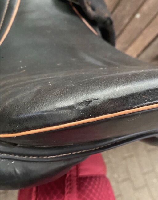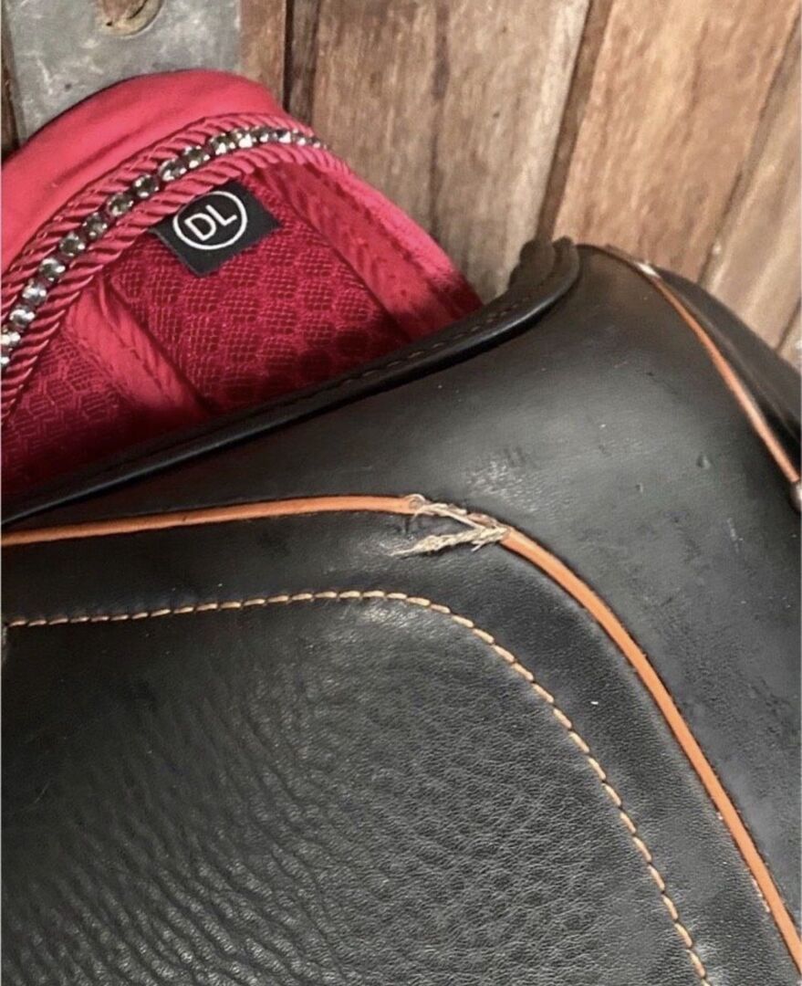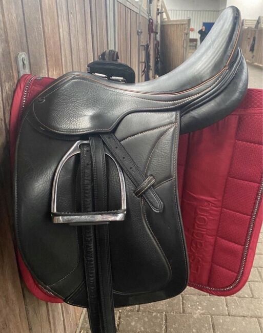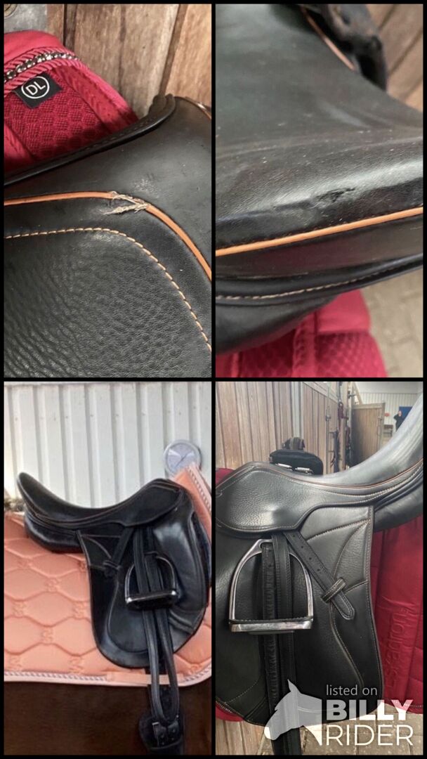Te koop chique dressuurzadel met oranje stiksels. Het is een 17,5 inch mono flap met een contactoppervlak van 42cm. Het zadel heeft normale gebruikssporen, maar er zit een klein smetje op de zadelklep (zie foto). De oranje naad op het zadel aan de linkerkant is beschadigd (zie foto), maar vormt geen beperking voor verder gebruik. Voor de rest altijd goed verzorgd. De slokdarmplaat is koud verstelbaar en de vulling is van wol. Het zadel is ideaal voor paarden met een korte rug omdat het contactoppervlak erg kort is. Het zadel werd gebruikt op mijn smalle Engelse volbloed maar is niet langer nodig.
