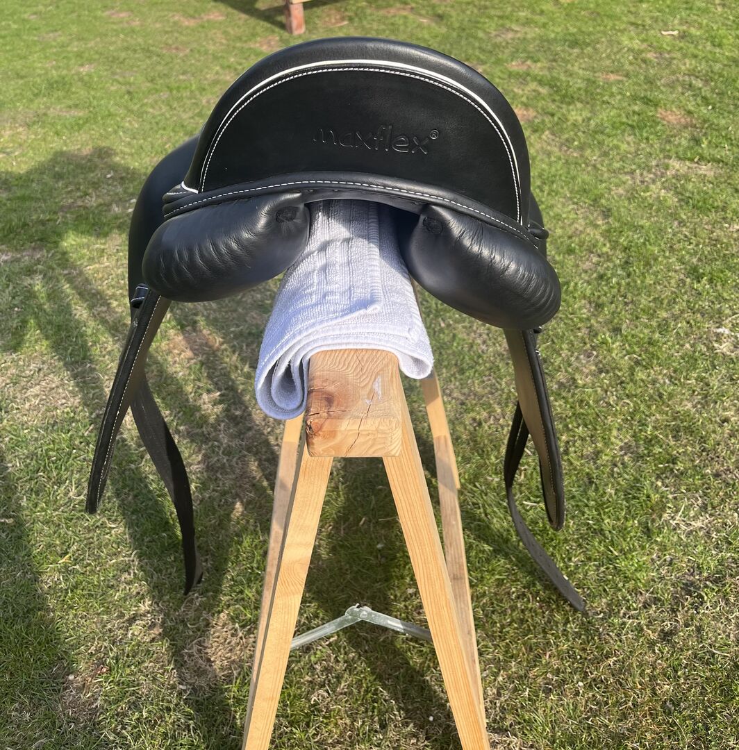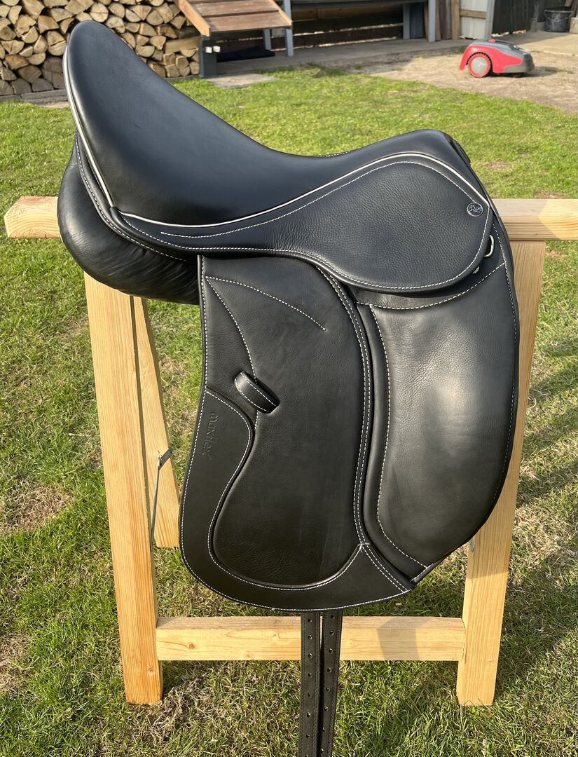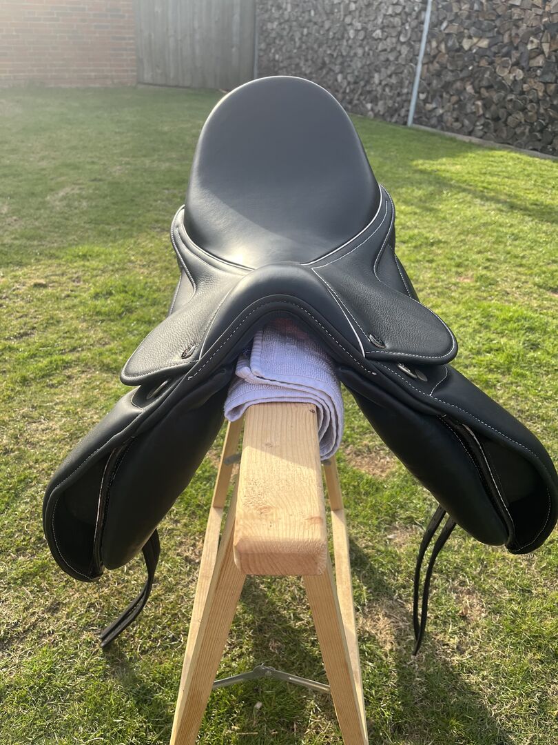 Kenmerken De Bella is een mono flap dressuurzadel waarbij de flap zich aan de voorkant over de klittenband pommels spreidt. De pommels kunnen naar wens worden geplaatst of weggelaten.