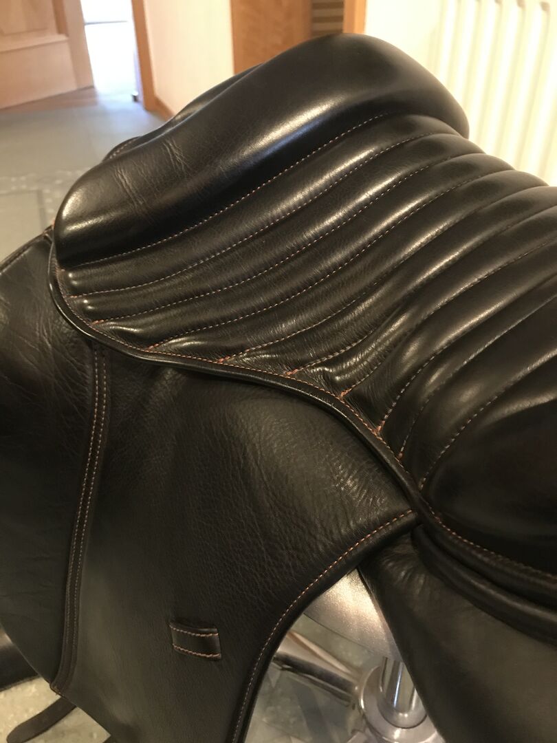 Zwart met contrasterende stiksels in cognac. Zeer mooi zacht premium leder, 17,5-18", klittenband panelen, brede ruggegraat kanaal, koud verstelbaar aan het paard in kamer en panelen.