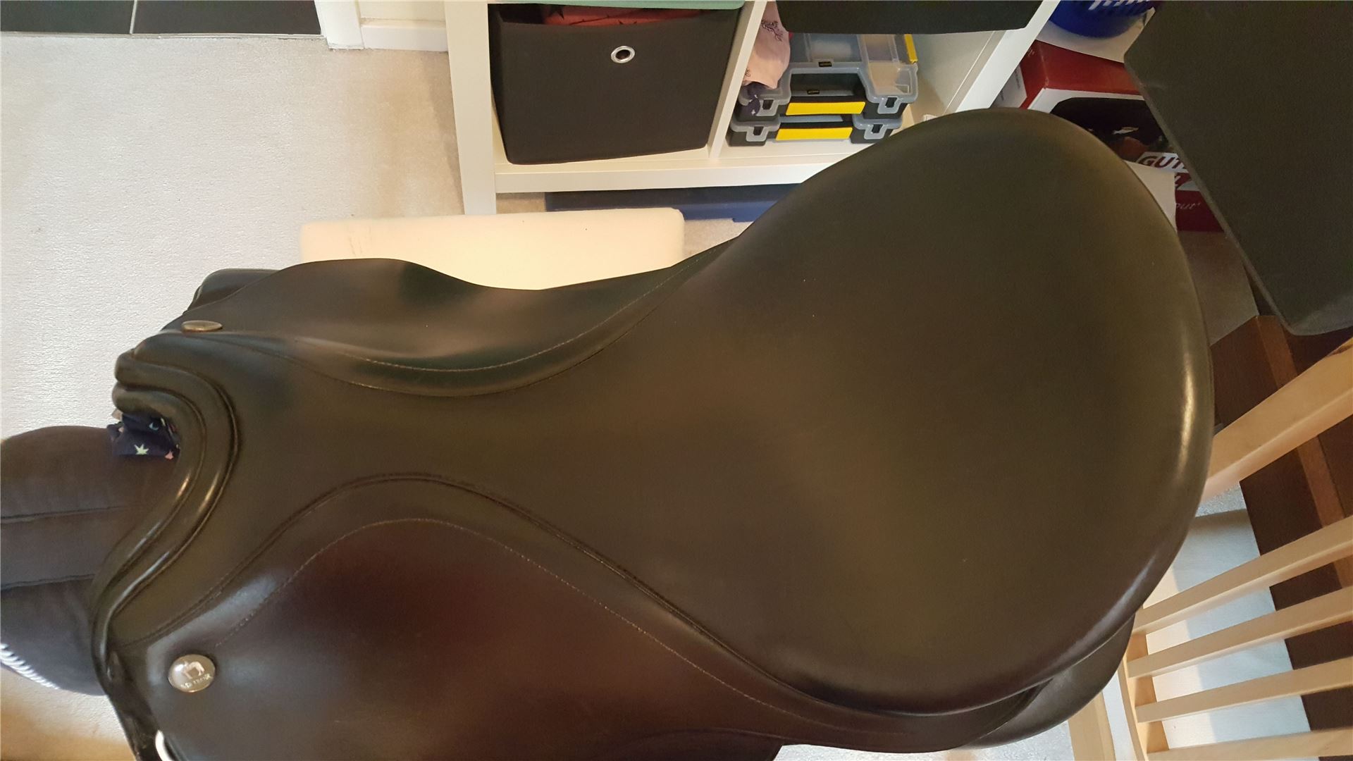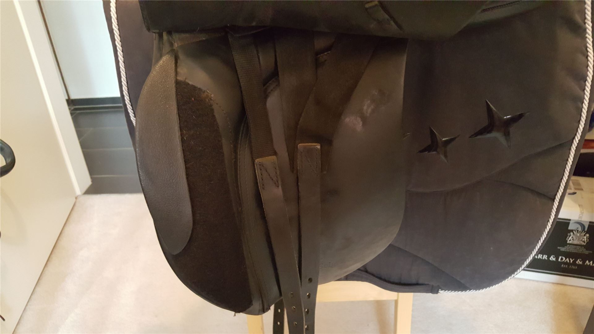 17,5 inch (maar lijkt meer op 17) kamer van gemiddelde breedte. Het contactoppervlak is ca. 40 cm, zoals u ook op de foto's kunt zien! Vergeet niet dat elk zadel anders is op elk paard, het hangt heel erg af van de rug van het paard! Het bijzondere zijn de vingerhoedjes met klittenband, op dit moment zitten er vrij kleine op, maar dat kan altijd veranderd worden! Het zadel is gekocht voor een paard met weinig rugspieren en vrij veel wreef, maar het ligt heerlijk! Het zadel kan worden uitgeprobeerd tegen aanbetaling van de aankoopprijs, maar wordt niet verzonden!