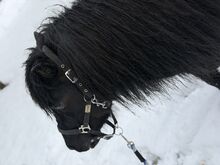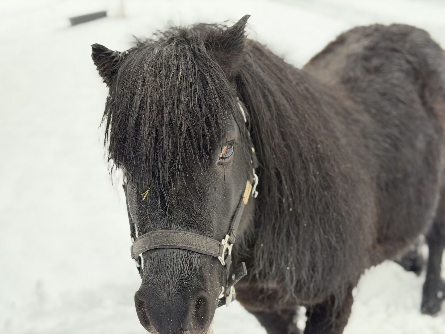 Klecks is een compacte, sterk gebouwde mini-shetty met een mooie, dikke manen en een vriendelijke uitdrukking. Hij is heerlijk in de dagelijkse omgang, mensgericht en kent de stalroutine heel goed.
