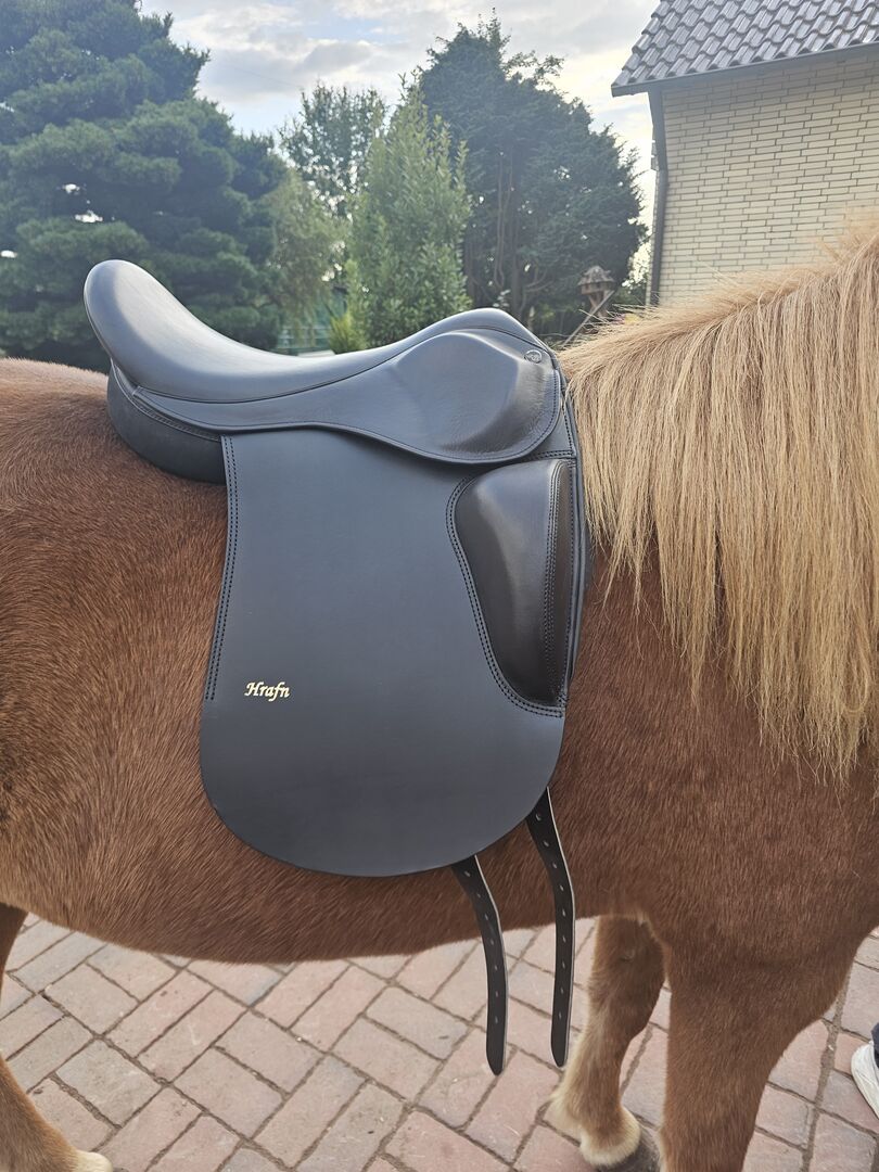 Hrafn is door de jaren heen het favoriete zadel van Tølthester geweest. Het zadel is ontworpen om nauw contact tussen paard en ruiter mogelijk te maken. De korte kniekussens van superzacht latex bieden goede ondersteuning, terwijl de ruiter vanaf de knie volledige bewegingsvrijheid heeft. Dit betekent dat je met je benen naar het paard kunt seinen zonder de structuur aan te tasten. Het zadel heeft een brede zadelklep die zorgt voor bewegingsvrijheid voor de paardenrug.
