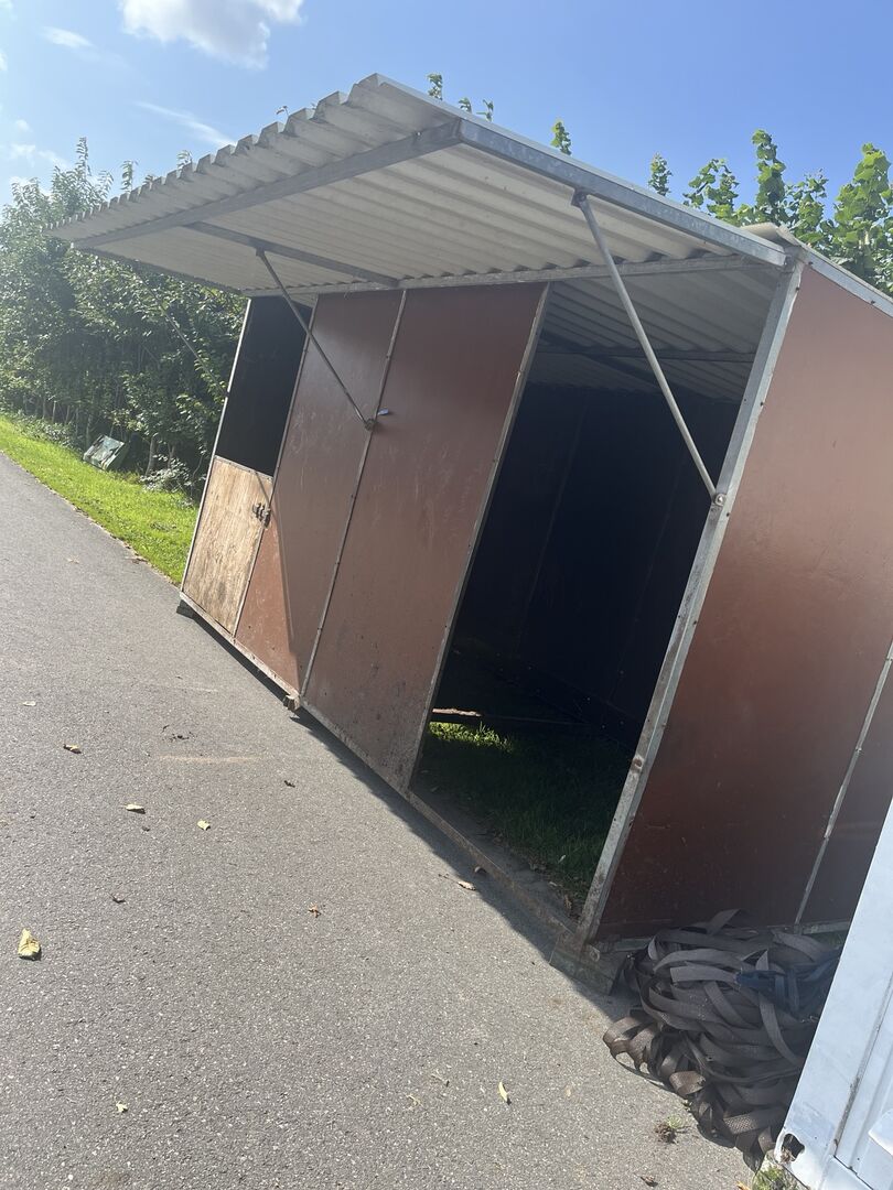 Mobiele weidehut te koop - Hallo, ik verkoop mijn gebruikte weidehut die zo goed als nieuw is. Hij is mobiel en kan worden verplaatst als dat nodig is. Ik heb hem gekocht voor mijn drie paarden. Ik heb het houden van paarden thuis echter opgegeven. De weidehut is daarom te koop. Er is een deur aan de linkerkant die naar wens open en dicht kan of gewoon open kan blijven staan. Ik had er aan de rechterkant een PVC-gordijn voor en een ronde baal in het midden, zodat de paarden aan beide kanten konden eten, omdat ik geen hooiruif had. Het heeft een luifel waar een paard makkelijk onder kan staan. Voor de onderbouw, zodat de stal niet in de modder hoeft te staan, hebben we latten geplaatst en daarop rubberen matten gelegd zoals op de foto, zodat de paarden ook af en toe kunnen liggen. De rubberen matten kunnen ook gekocht worden. De rubberen matten zijn ongeveer 20-22 stuks (22 m²) Als je vragen hebt, neem dan contact met ons op via telefoonnummer 0173 2188968 of via WhatsApp.