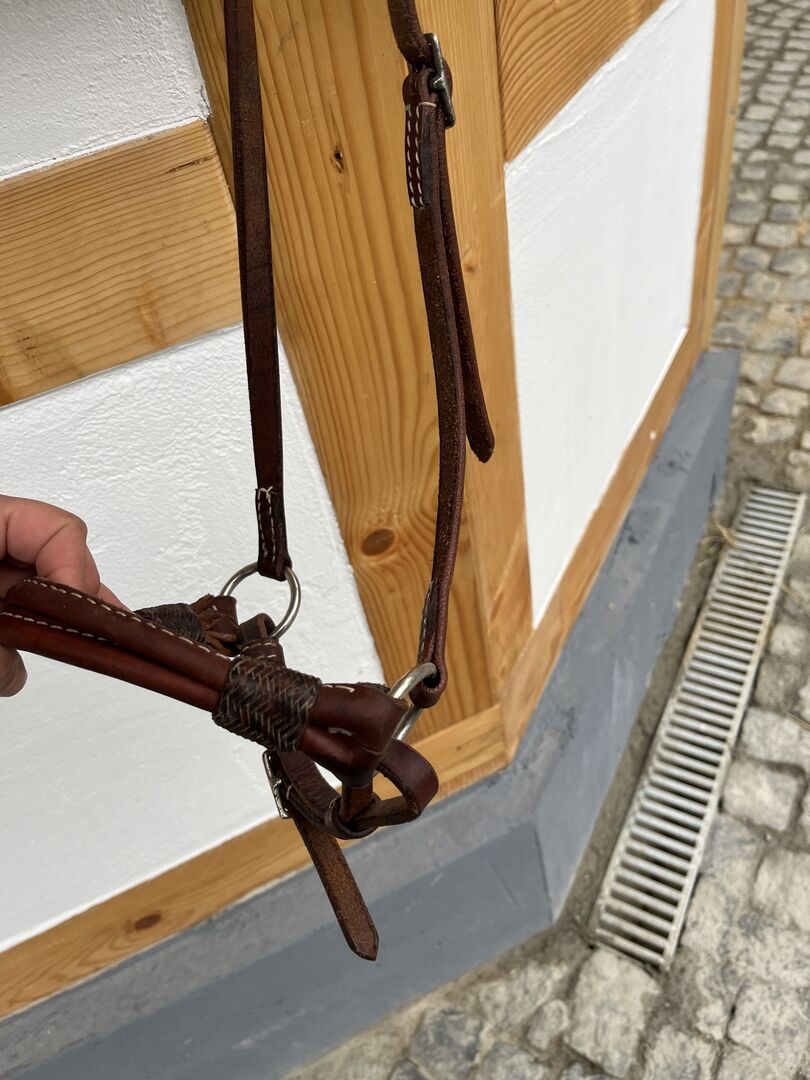 Mondkapje Western - De mondsluiting voorkomt zachtjes dat de paardenmond opengaat tijdens het werk. Gemaakt van tuigleer in zeer stevige, geoliede kwaliteit. Met rondgestikte neusriem en zilverkleurig beslag. Slechts zeer zelden gebruikt. Als je vragen hebt - schrijf gerust - verzending mogelijk.