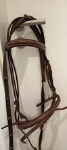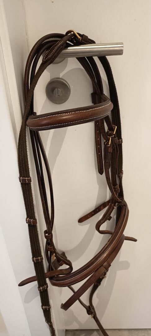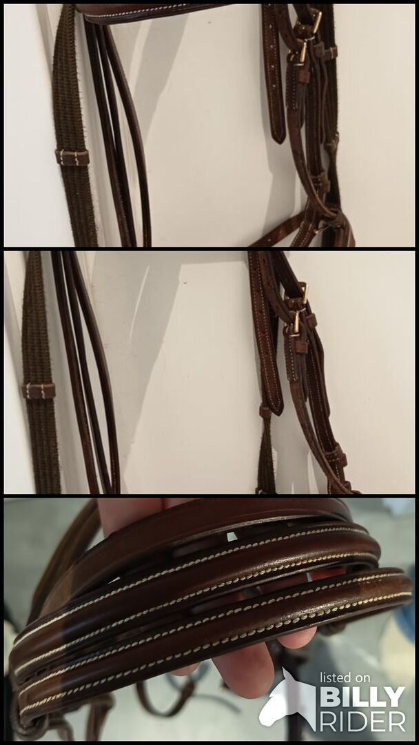 Mooie bruine snaffle, contrasterende stiksels, zo goed als nieuw, VB/Cob - Het hoofdstel met witte stiksels werd alleen naar het paard gebracht om te passen en een paar keer voor bit training. Door de groei van het paard paste het helaas niet meer toen het paard werd ingereden. Daarom is het als nieuw.
