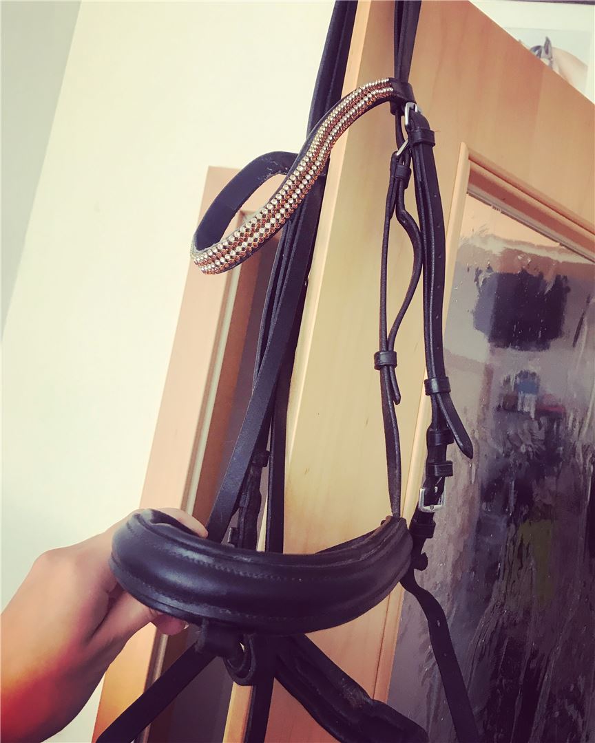 HKM hoofdstel: warmbloed met patent, glitter frontriem, zachte voering 25€.