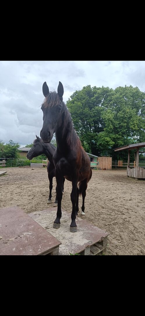 Mooie merrie binnenkort een klein paard - Prachtig barok merrieveulen Knabstrupper x Fries (vader) met geweldige gangen (echt mooie bewegingen) te koop. (Helaas moet ik plotseling voor mijn ernstig zieke moeder zorgen, wat ook tijd- en geldverlies betekent). Tromma is geboren eind april 2023. Haar lieve mama is ook te bezichtigen. Lieve Tromma is gechipt+ heeft een paspoort, is ingeënt en ontwormd. Ze leert snel, loopt goed aan een halster (ook door de wei en alleen aan de lijn, weg van de kudde), kan natuurlijk hoeven geven, is mensgericht en vindt het heerlijk om de hele dag geknuffeld te worden. Ze kent kinderen, honden, katten en tractoren. Ze is klaar om naar buiten te gaan, met een beetje geduld gaat ze mee op de trailer. Tromma is erg leergierig, moedig en nieuwsgierig en wil er altijd bij horen. Ze wordt naar verwachting ongeveer 1.50m (mama 1.48m, papa 1.52m, foto's beschikbaar). Ze woonde eerst bij ons in een gemengde kudde, nu in een kleine kudde merries van dezelfde leeftijd en merrietraining in een open stal met dagelijkse toegang tot de paddock. Ze is vertrouwd met kampvuren, pierenbadjes, diverse speeltoestellen en geluiden. Dus als je je eigen paard wilt trainen, zul je zeker veel plezier beleven aan Tromma. Ik kan me haar voorstellen als een indrukwekkend rijpaard, maar ook als koetspaard. Meet and greet is welkom en in overleg altijd mogelijk. Particuliere verkoop. Geen garantie. Geen teruggave. Volledige betaling voor inladen.