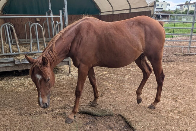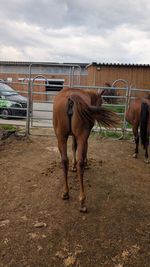Kitty Metallic Cat - een veelbelovende Quarter Horse merrie, geboren op 4.2024, met een geschatte eindhoogte van 150 cm, met een eersteklas afstamming - een echt juweeltje voor show, vrije tijd en fokkerij! Dit jong imponeert met een correct exterieur, veel fundament en een goede bespiering. Ze is opgegroeid in een kudde en is vertrouwd met zowel open stalling als weidegang. Kitty's karakter laat niets te wensen over: Mensgericht, vriendelijk, slim, nieuwsgierig en knuffelig. Ze wordt regelmatig behandeld, kent het veulen-1×1, kan rustig worden aangebonden en werkt altijd mee in de dagelijkse omgang. Een echte blikvanger met veel beweging - een topper voor de springsport! Kitty heeft alle voorwaarden om zich te ontwikkelen tot een succesvol showpaard of betrouwbare vrijetijdspartner - ook zeer interessant als fokpaard. Ze is een kleindochter van Metallic Cat en Smooth As A Cat. Haar vader is de succesvol getoonde Titanium Toy. Vanwege een inkrimping van de kudde wordt deze schat met pijn in het hart verkocht.
