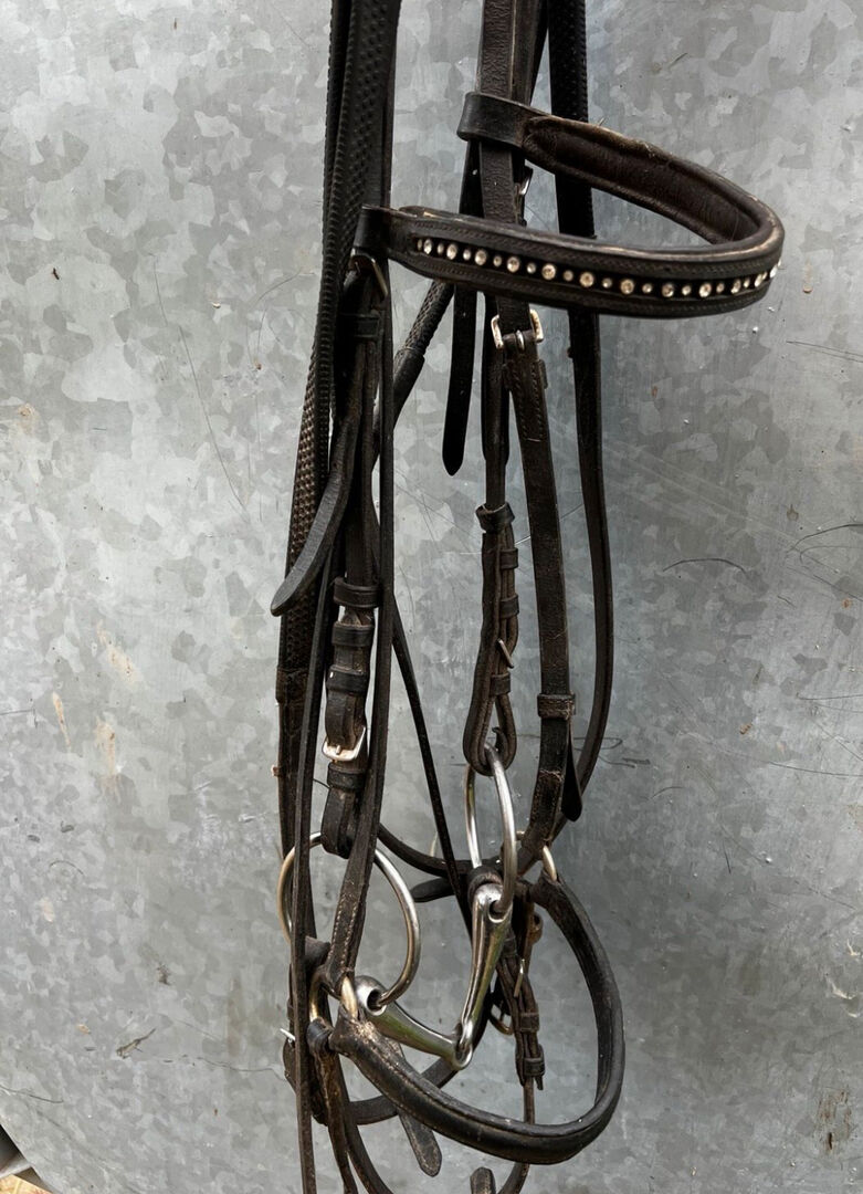 Mooie snaffel met teugels COB - Ik bied een heel mooi, goed onderhouden hoofdstel te koop aan. Het is zwart en gemaakt van zeer stevig, zacht leer. Het hoofdstel wordt verkocht met bit en teugels. Het is maat COB.