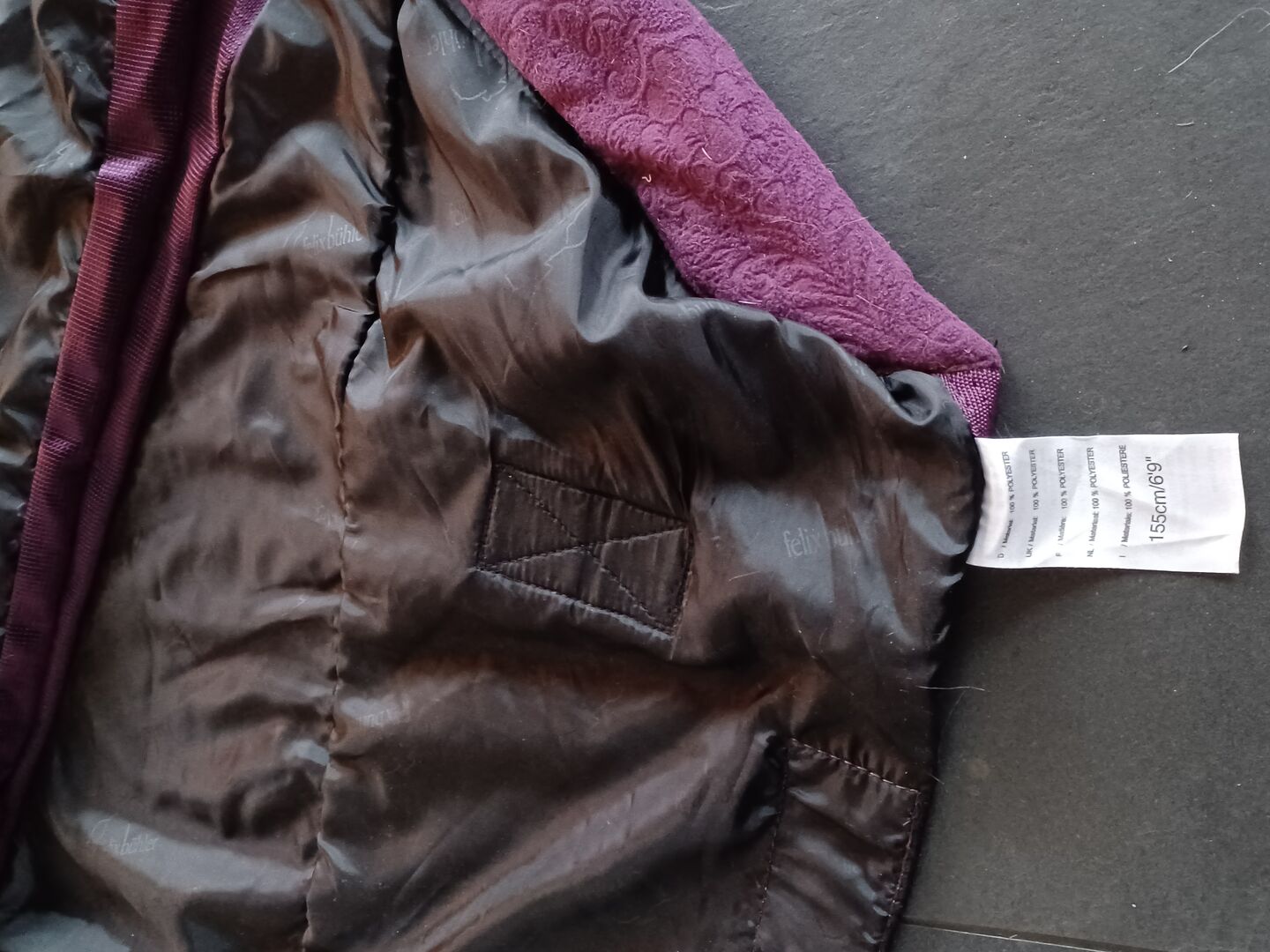 Netdeken met fleece rug 155cm - Mooie deken van Felix Bühler. Het ruggedeelte is gemaakt van fleece met mooie ornamenten. Een afneembare buikriem optimaliseert de deken voor stal en transport. Donkere bessen. In het gaasgedeelte lichte vlekken van het klittenband (gebeurd tijdens het wassen).