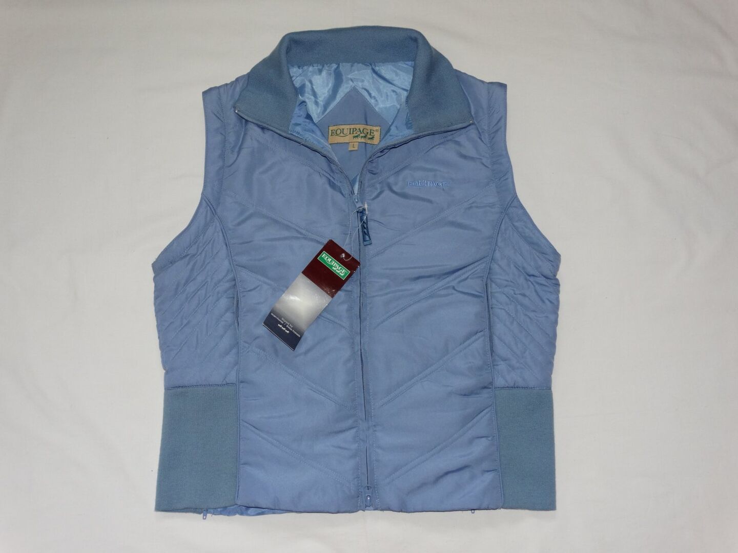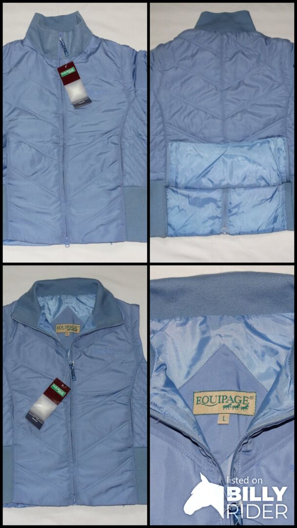 - Merk: Equipage - Maat: L - Kleur: Lichtblauw - Afneembare mouwen met manchetten - 2-weg ritssluiting - twee zijzakken met rits - twee rijsplitten achter - Licht gevoerd - 100% polyester - 30°C wasbaar - originele prijs 49,90€