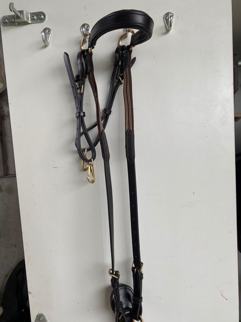 Nieuw borstschild in bruin - Verkoop een nieuwe, donkerbruine borstplaat, maat volbloed. Hoogwaardig leer, bruine elastische inzetstukken en afneembare vork. Vooral mooi door het gouden beslag. NP: 129,00