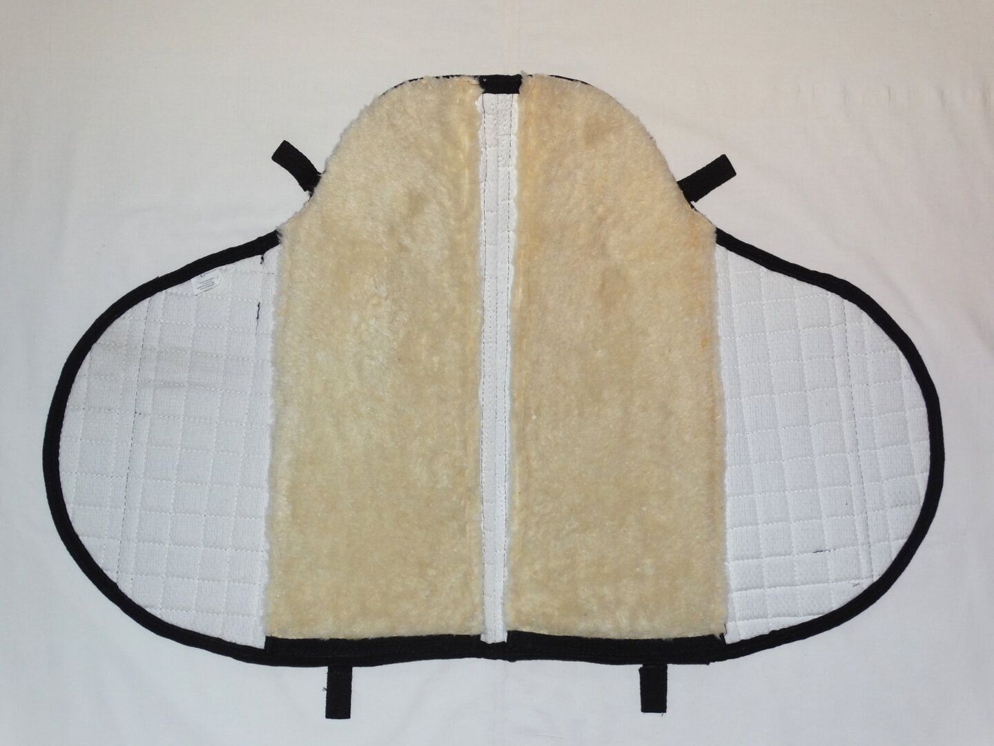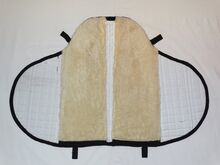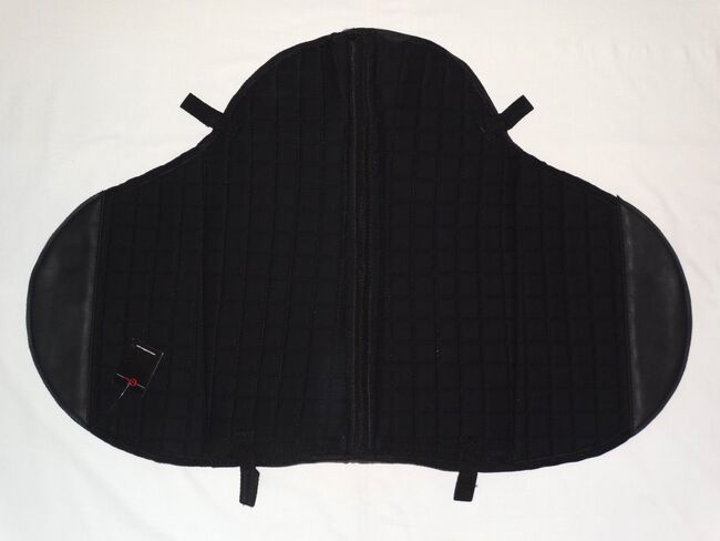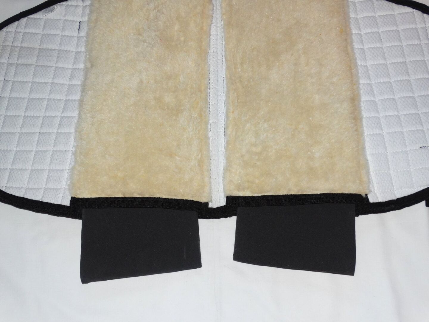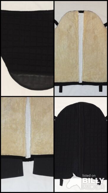 - Merk: Covalliero (Kerbl) - Model: Vrijheid, 32440 - Maat: VS, ruglengte 61 cm, flaplengte 48 cm - Kleur: zwart/naturel/wit - Zakken van imitatiebont met klittenband (voorkant) - incl. uitneembare, drukverlagende, zachte synthetische rubberen inzetstukken, standaard 8 mm - Riemversteviging aan de onderrand van kunstleer - Buitenkant: 100% katoen, vulling: 100% polyester (schuim) - 30°C wasbaar