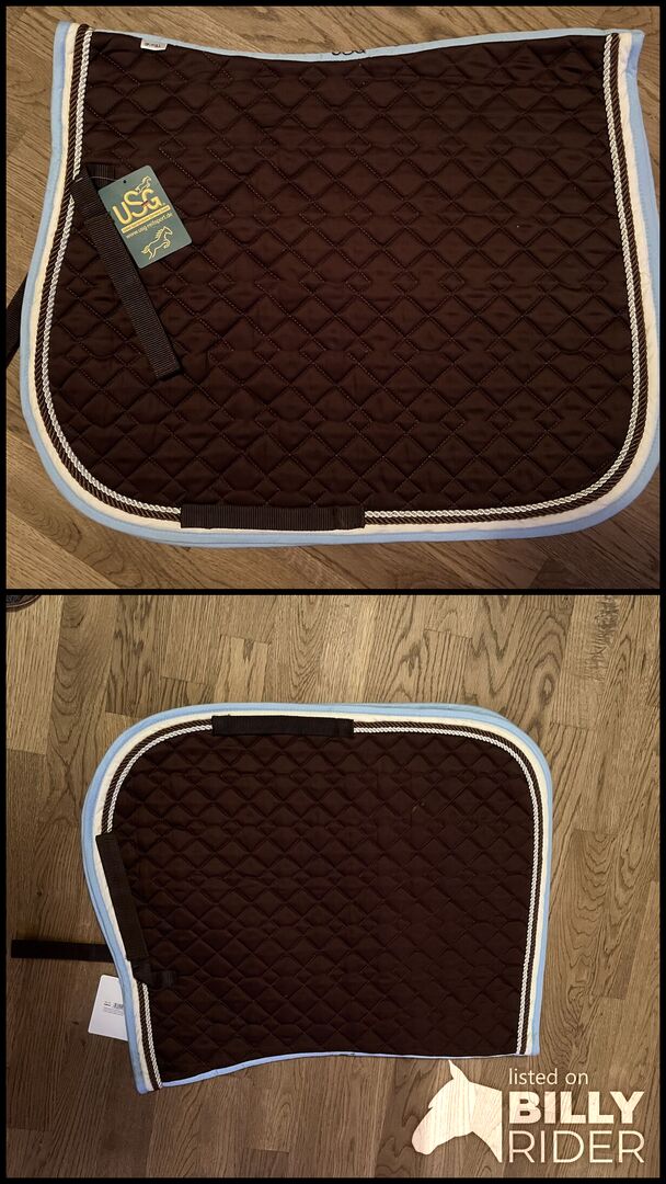 Nieuw dressuurzadeldek van USG, groot paard - Donkerbruin zadeldek, lichtblauw, beige, afgebiesd, met bruin en beige. Koord, nieuw met label. Particuliere verkoop, daarom geen garantie of retournering. Verzending mogelijk tegen betaling van kosten.